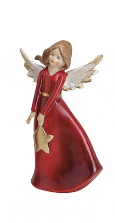 Przepiękny anioł w długiej czerwonej sukni. Figurka ceramiczna. Zdobienia w kolorze złotym.