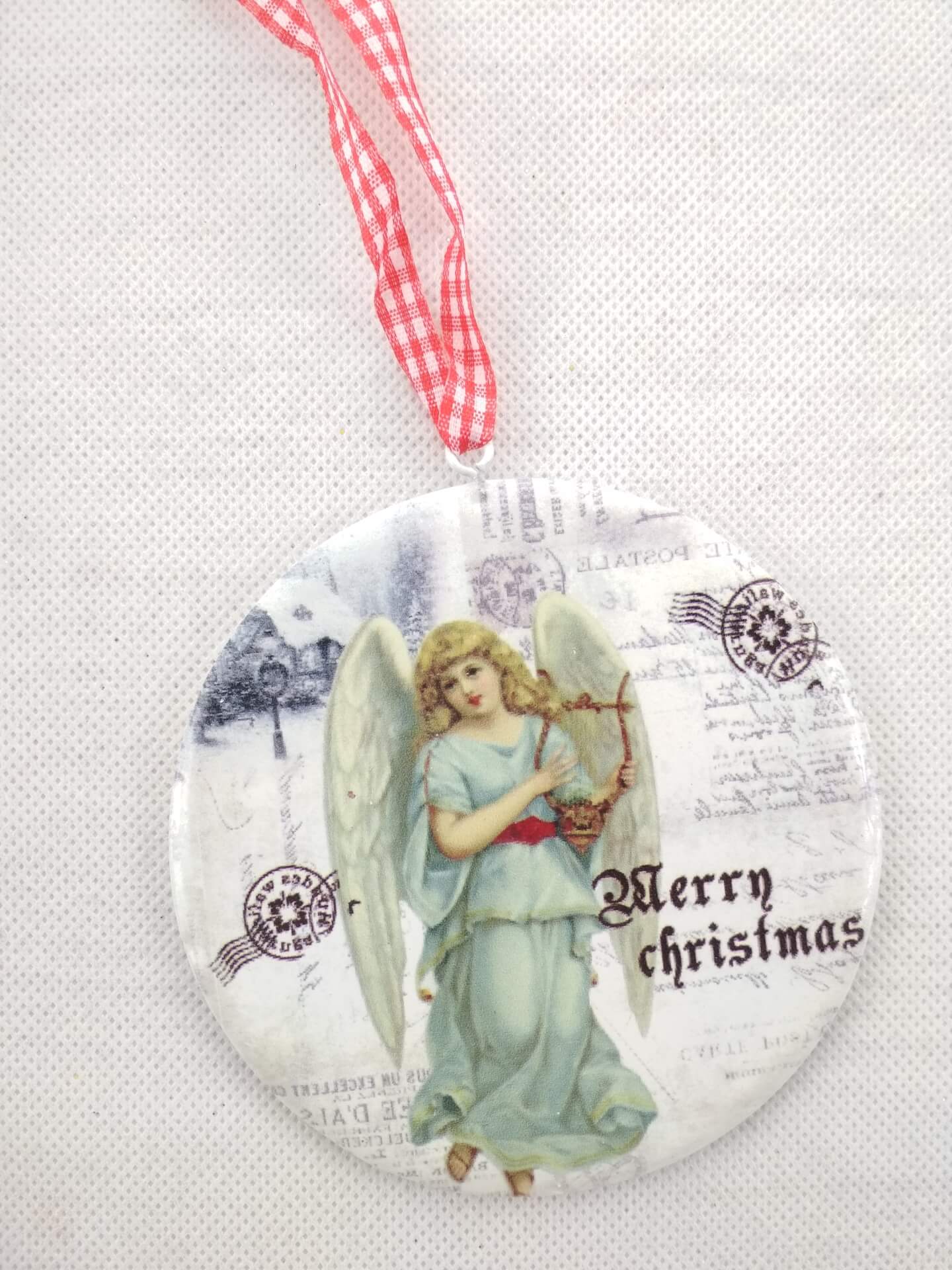 Płaska, metalowa bombka z wizerunkiem anioła. Styl vintage.