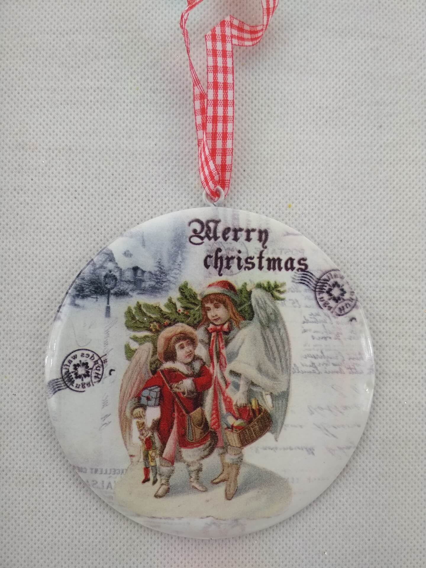 Płaska, metalowa bombka z wizerunkiem anioła. Styl vintage.