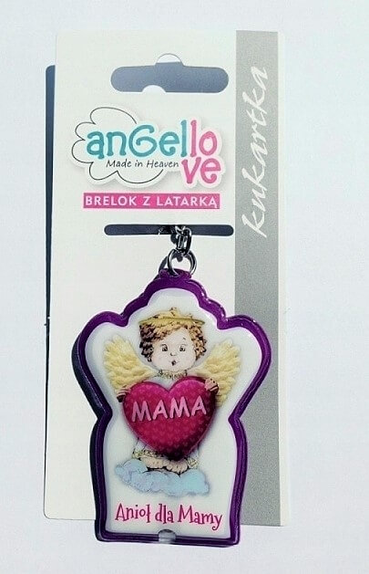 Breloczek do kluczy z latarką. Ciekawy kształt. Napis "Anioł dla Mamy" oraz napis "Mama" w serduszku trzymanym przez Aniołka.