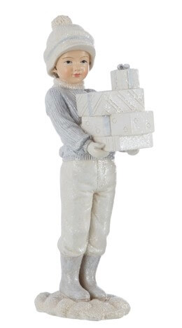 Figurka chłopca trzymającego prezenty.. Całość wykonana z tworzywa. Chłopiec w stylizacji zimowej. Całość delikatnie przyprószona brokatem,