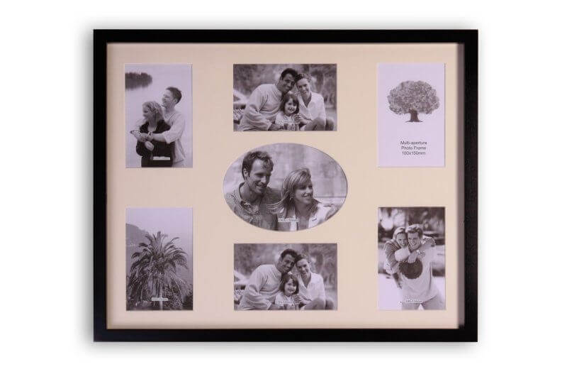 Ramka na 7 zdjęć drewniana. Czarna ramka, kremowe passe-partout.