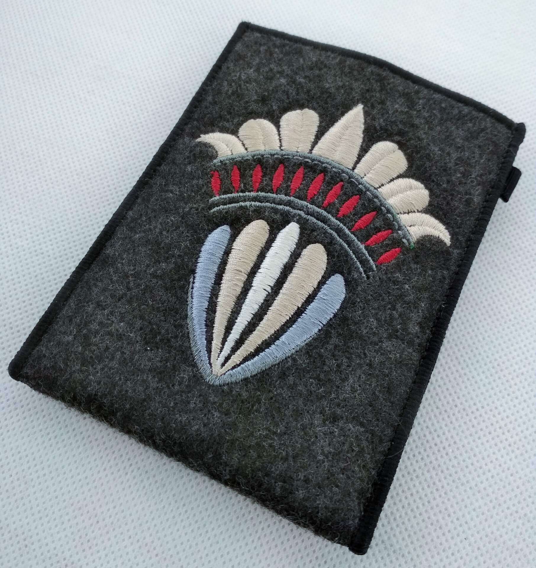 Etui na komórkę z kolekcji Destiny ozdobiony wielokolorowym haftem - autorski wzór Goshico. Wykonane ręcznie z grubego, usztywnianego filcu.
