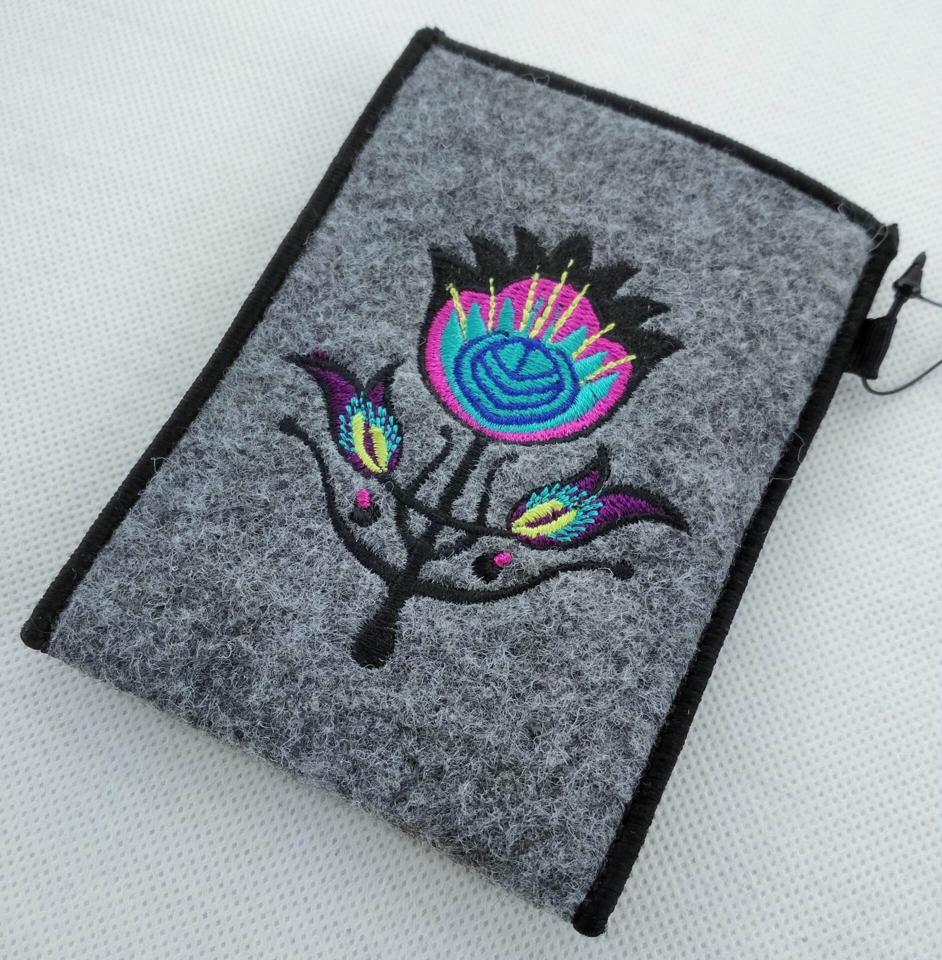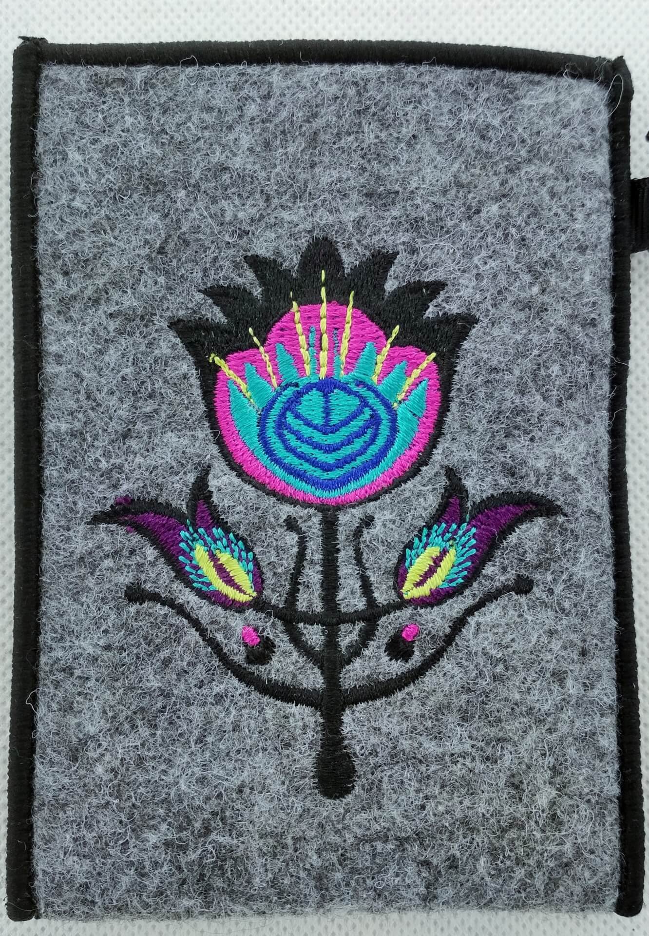 Etui na komórkę z kolekcji NEW FOLK wykonane jest ręcznie z grubego, usztywnianego filcu. Ozdobione jest kolorowym haftem maszynowym inspirowanym wycinanką łowicką. Całość obszyta jest satynową nicią, a środek wyklejony jest wzmacniającym materiałem.