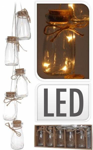 Girlanda LED z 5 szklanymi buteleczkami. Ciepłe światło tworzy uroczy klimat. Cudownie prezentuje również się jako świąteczna dekoracja.
