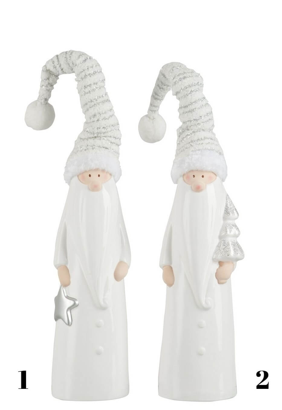 Wysoki, ceramiczny Gwiazdor Grzegorz. W dłoni trzyma srebrną gwiazdę. Na głowie ma zimową czapkę, w której znajduje się drucik, dzięki któremu możemy nadać jej dowolny kształt.