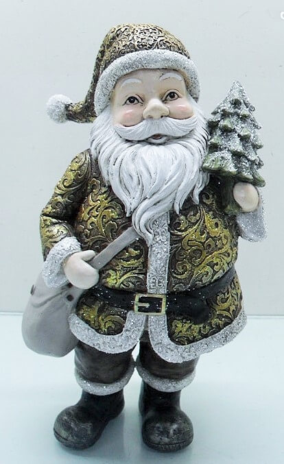 Ceramiczna figura wesołego Gwiazdora trzymającego w dłoni choinkę. Przez ramię przewieszona torba.