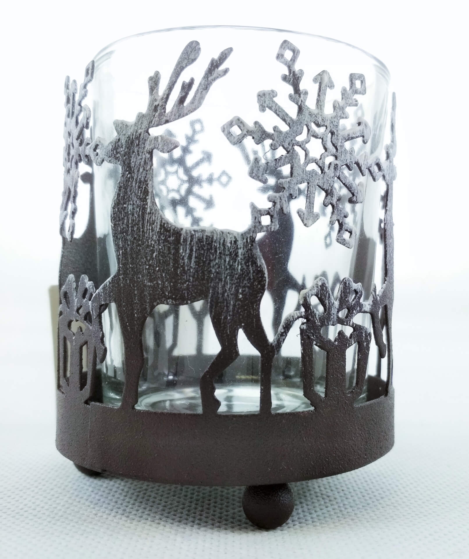 Metalowa osłonka na kieliszek z motywem reniferów.