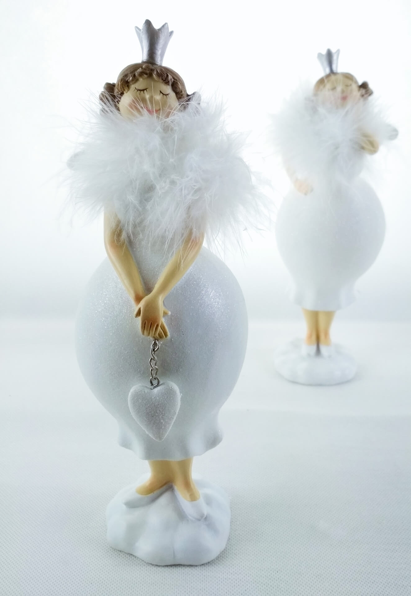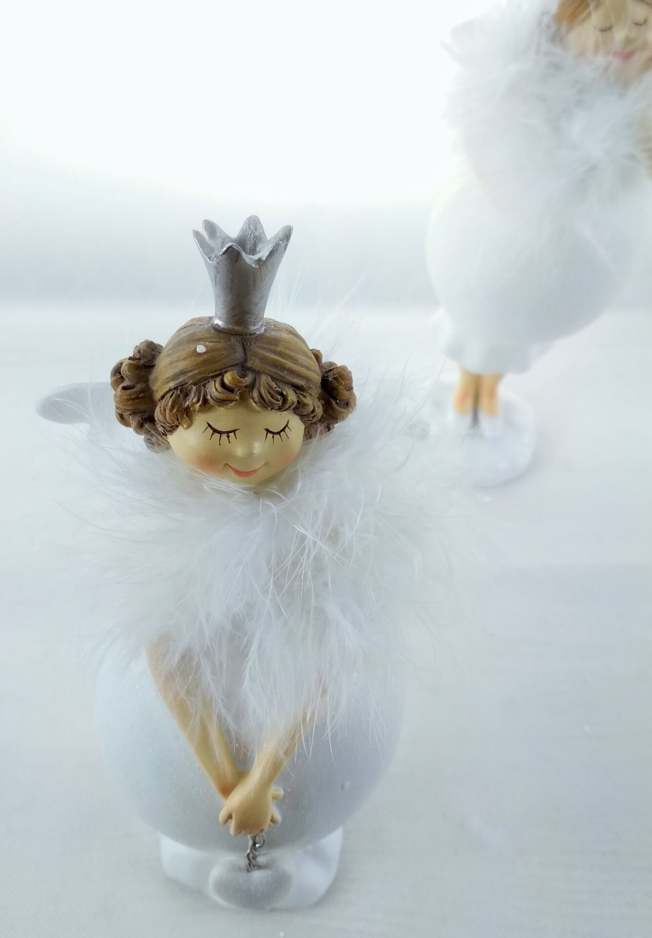 Ceramiczna figurka kobiety-anioła. Ubrana na biało, sukienka oprószona brokatem. Otulona białą etolą wykonaną z piór. Na głowie korona w kolorze srebrnym.