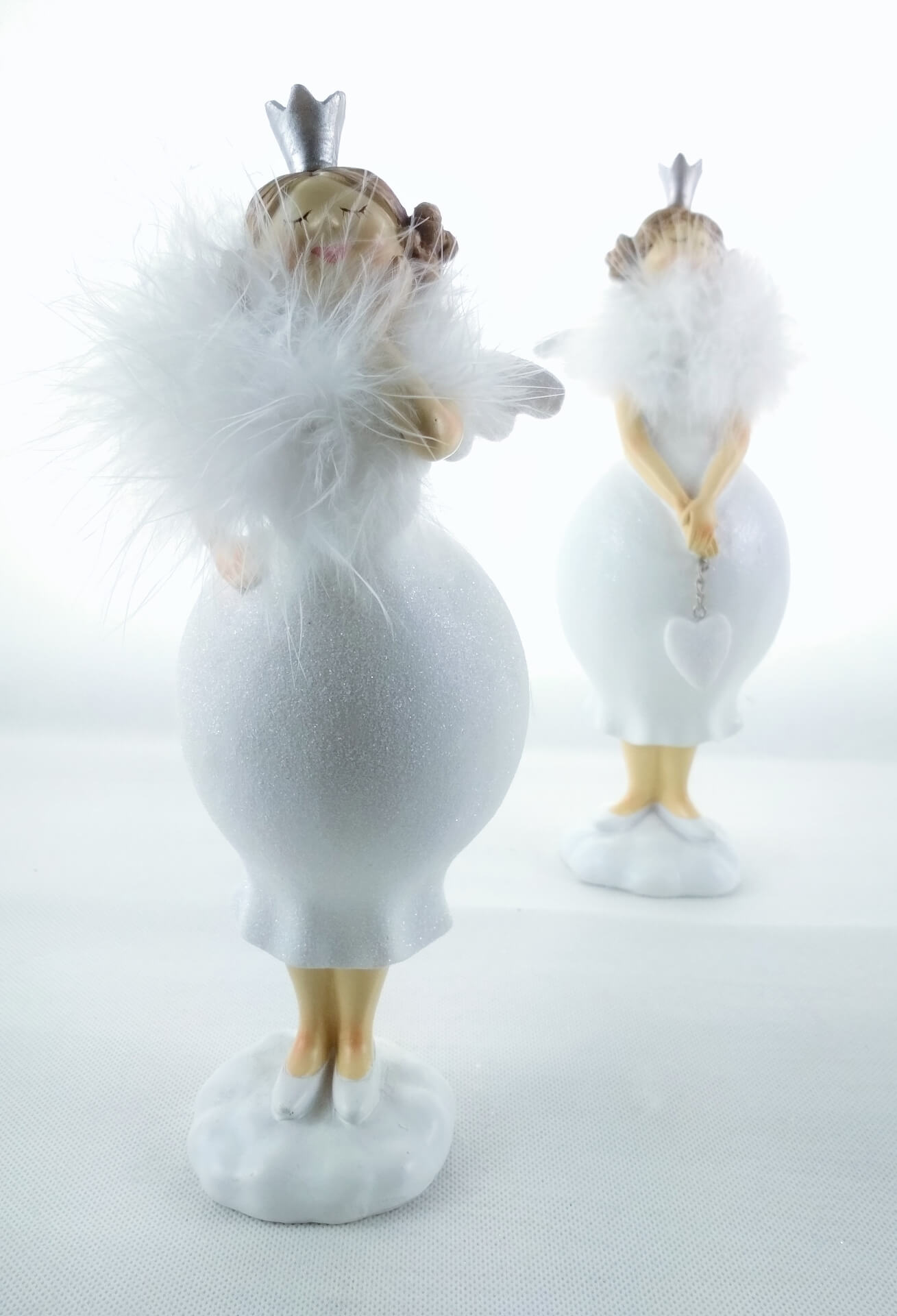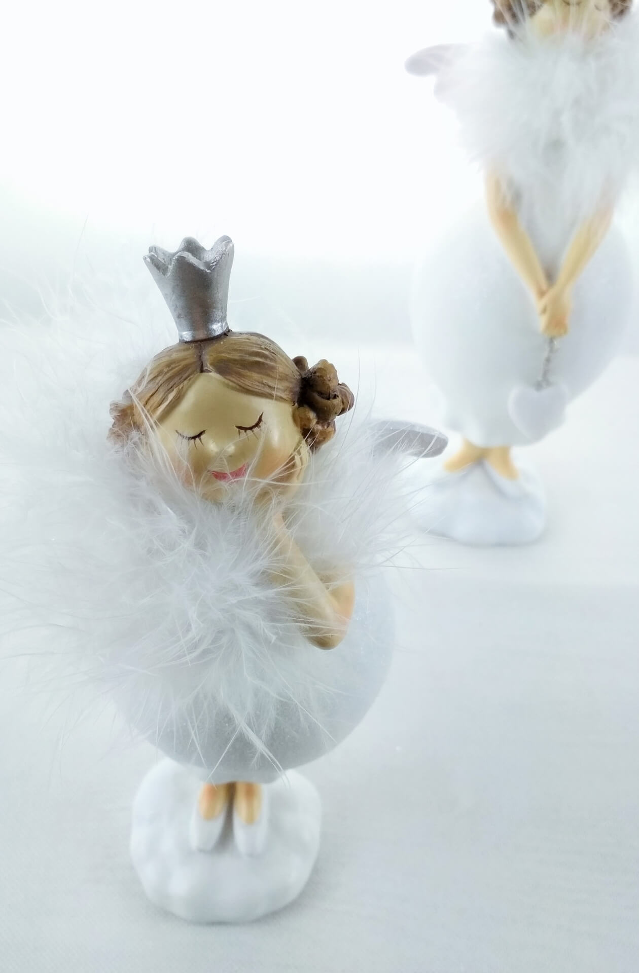 Ceramiczna figurka kobiety-anioła. Ubrana na biało, sukienka oprószona brokatem. Otulona białą etolą wykonaną z piór. Na głowie korona w kolorze srebrnym.