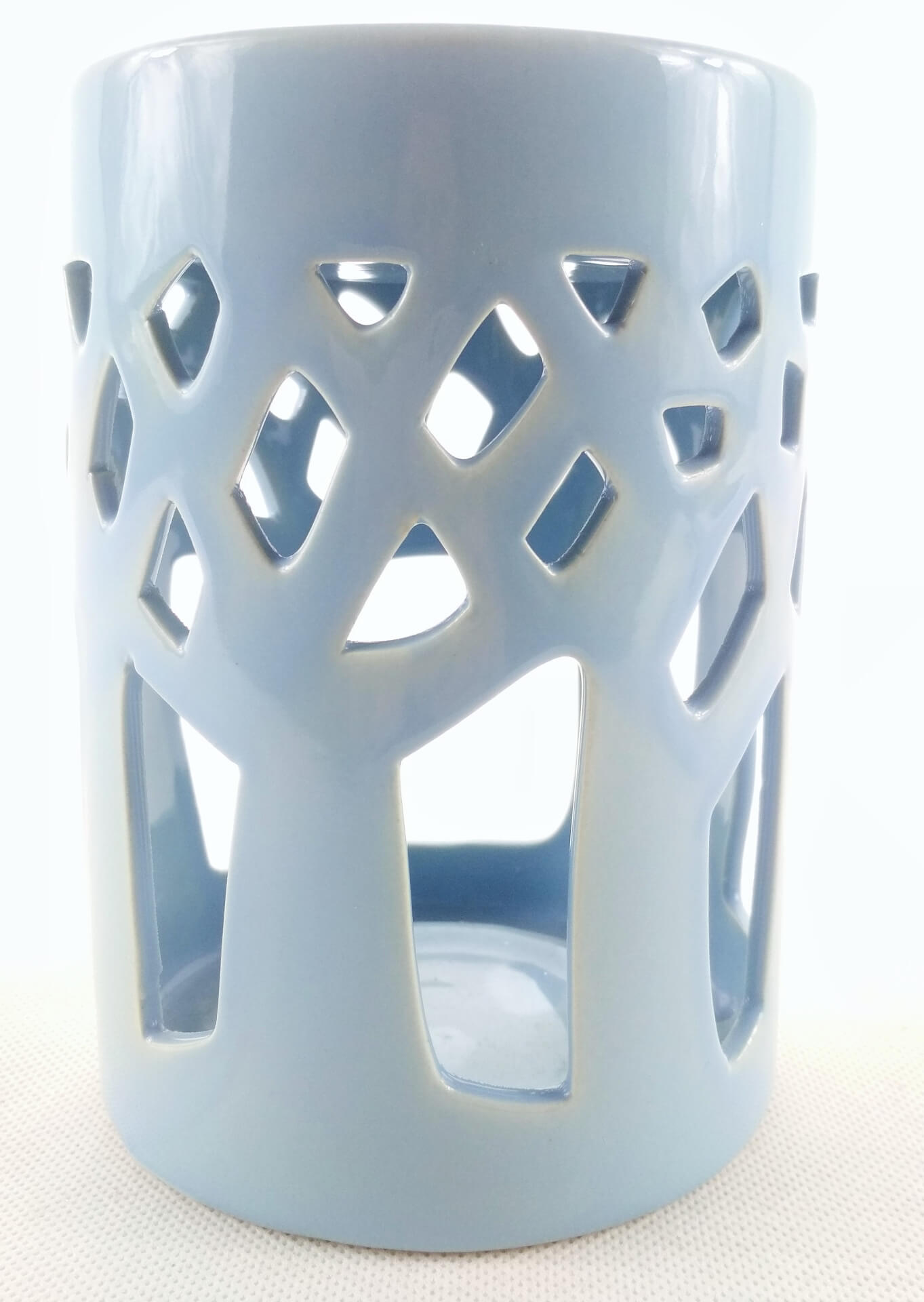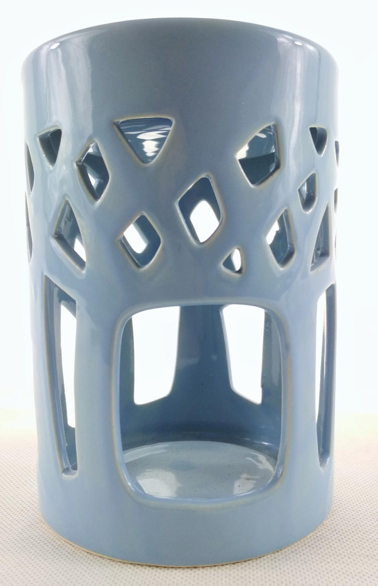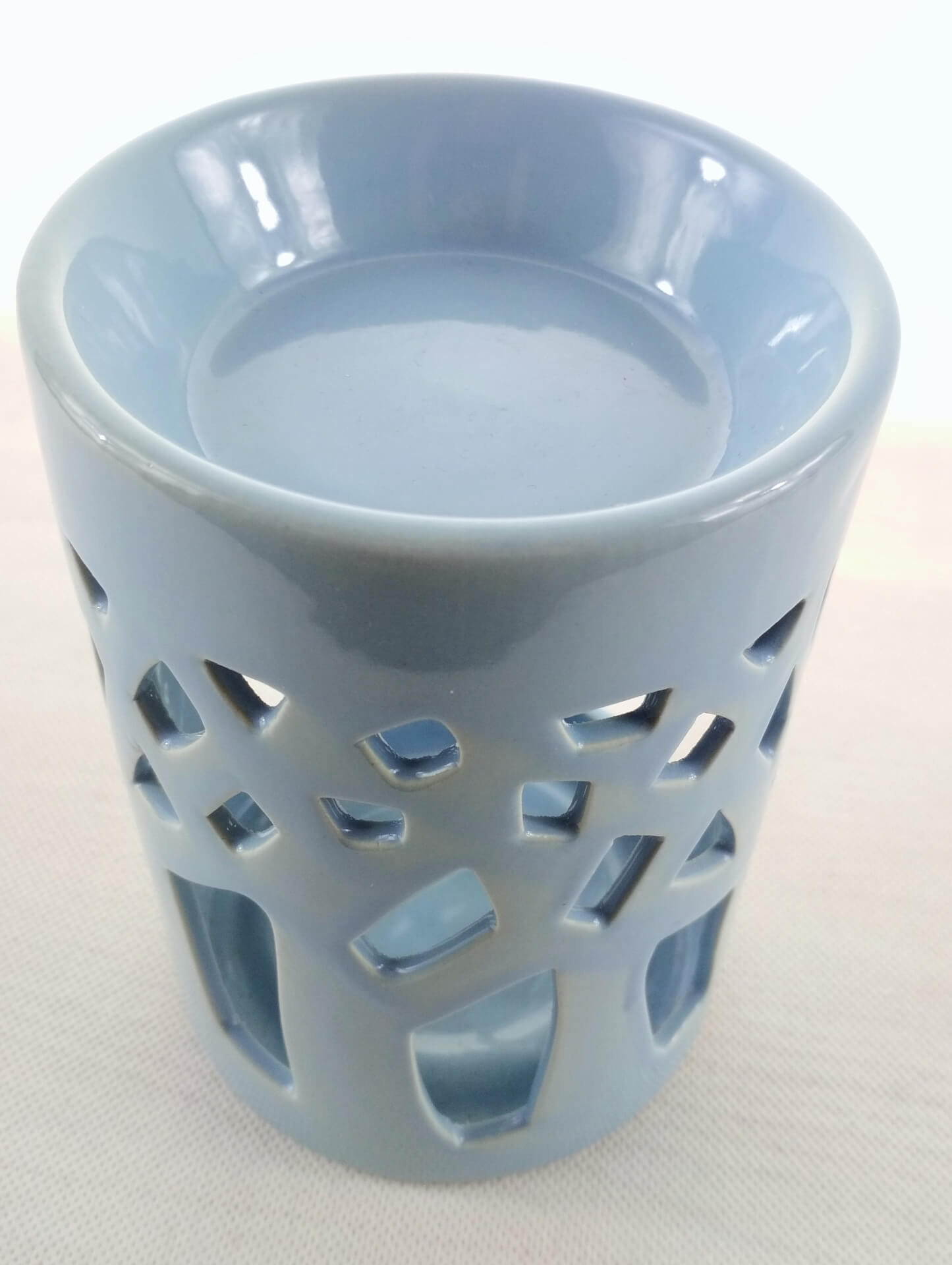 Ceramiczny kominek na woski i olejki zapachowe. Kształt walca, ażurowe ozdobne wycięcia. Kolor błękitny.