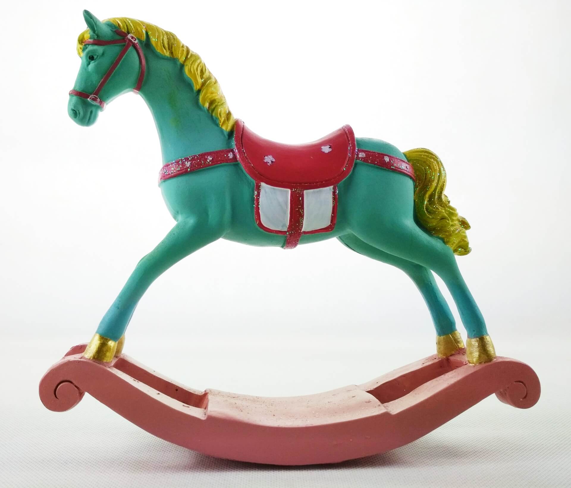 Konik turkusowy z żółtą grzywą. Detale w odcieniach ciemengo różu, bieli oraz złota.. Delikatne zdobienia brokatowe.