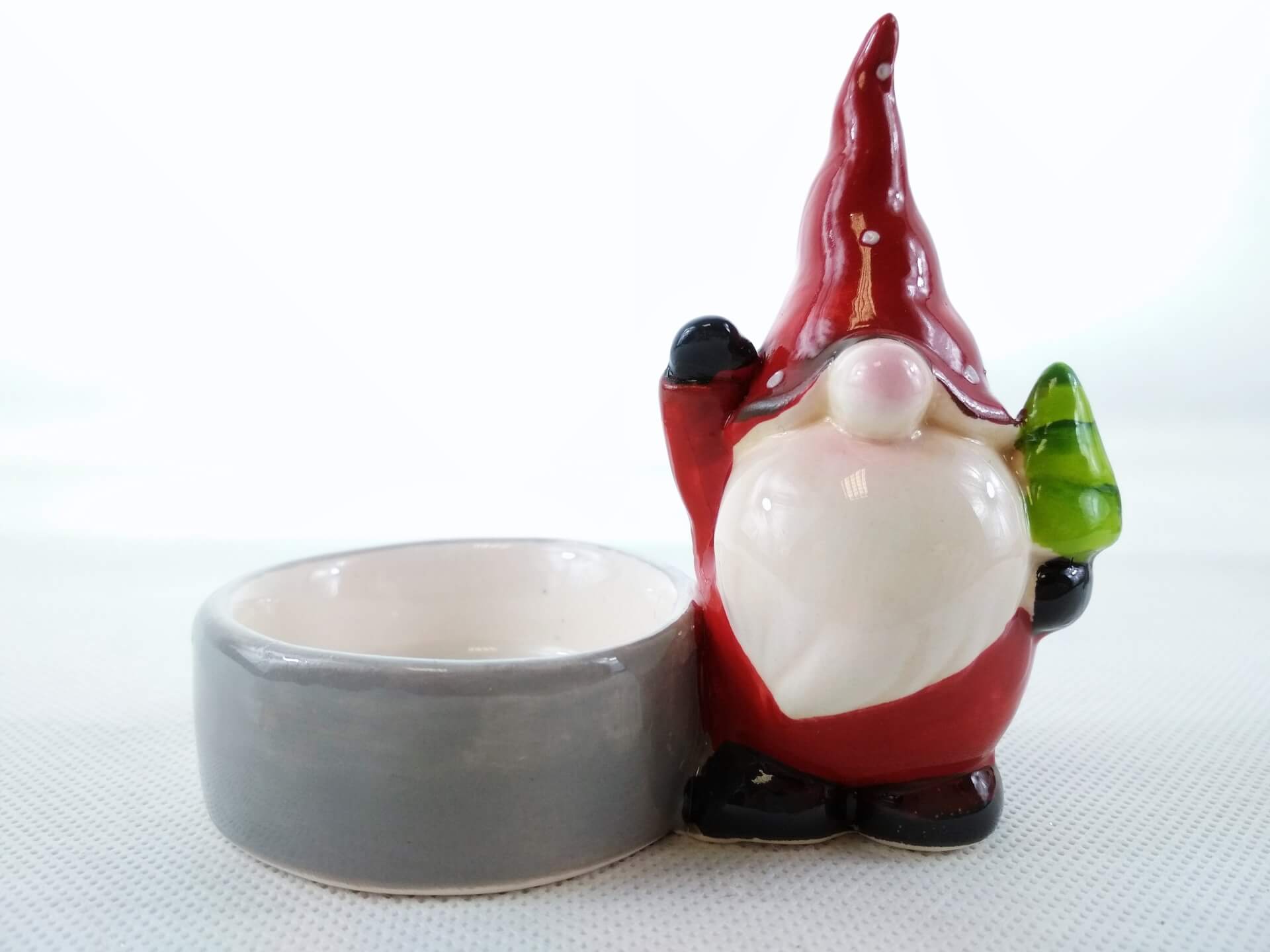 Figurka krasnala trzymającego malutką choinkę, obok miejsce na świeczkę. Całość wykonana z ceramiki.