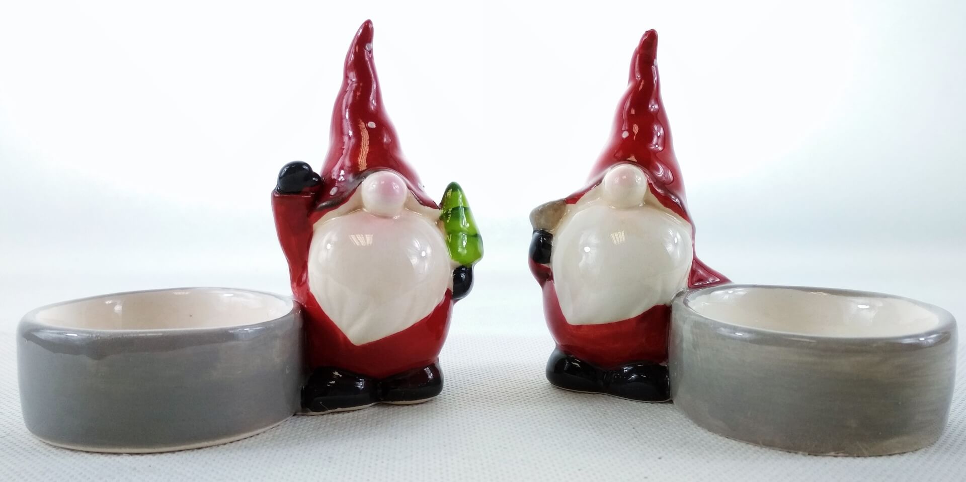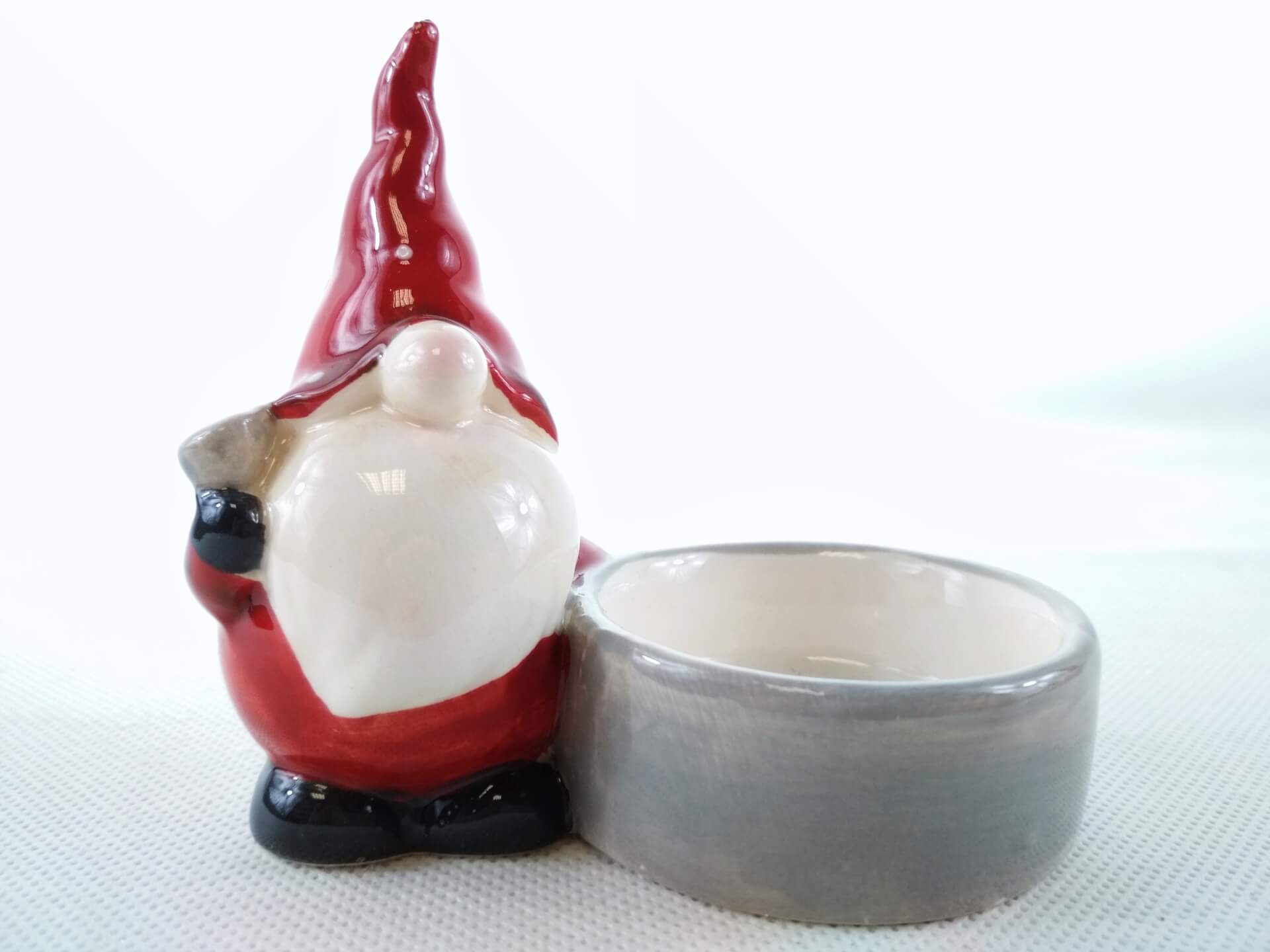 Figurka krasnala trzymającego malutki dzwoneczek, obok miejsce na świeczkę. Całość wykonana z ceramiki.