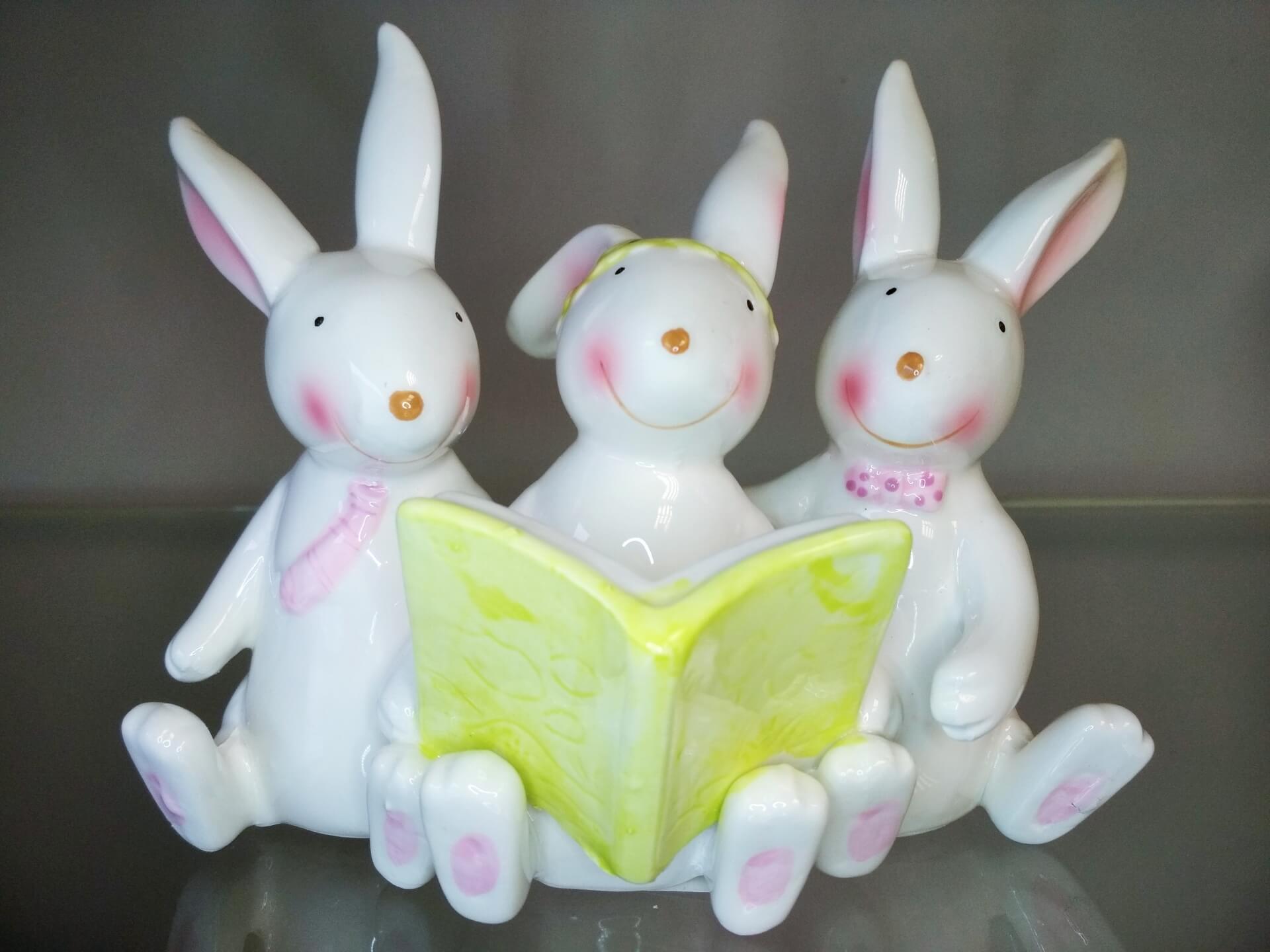 Ceramiczna figurka przedstawiająca 3 siedzące króliczki czytające książkę. Króliczki w kolorze białym, delikatne akcenty w pastelowych kolorach różu i zieleni.