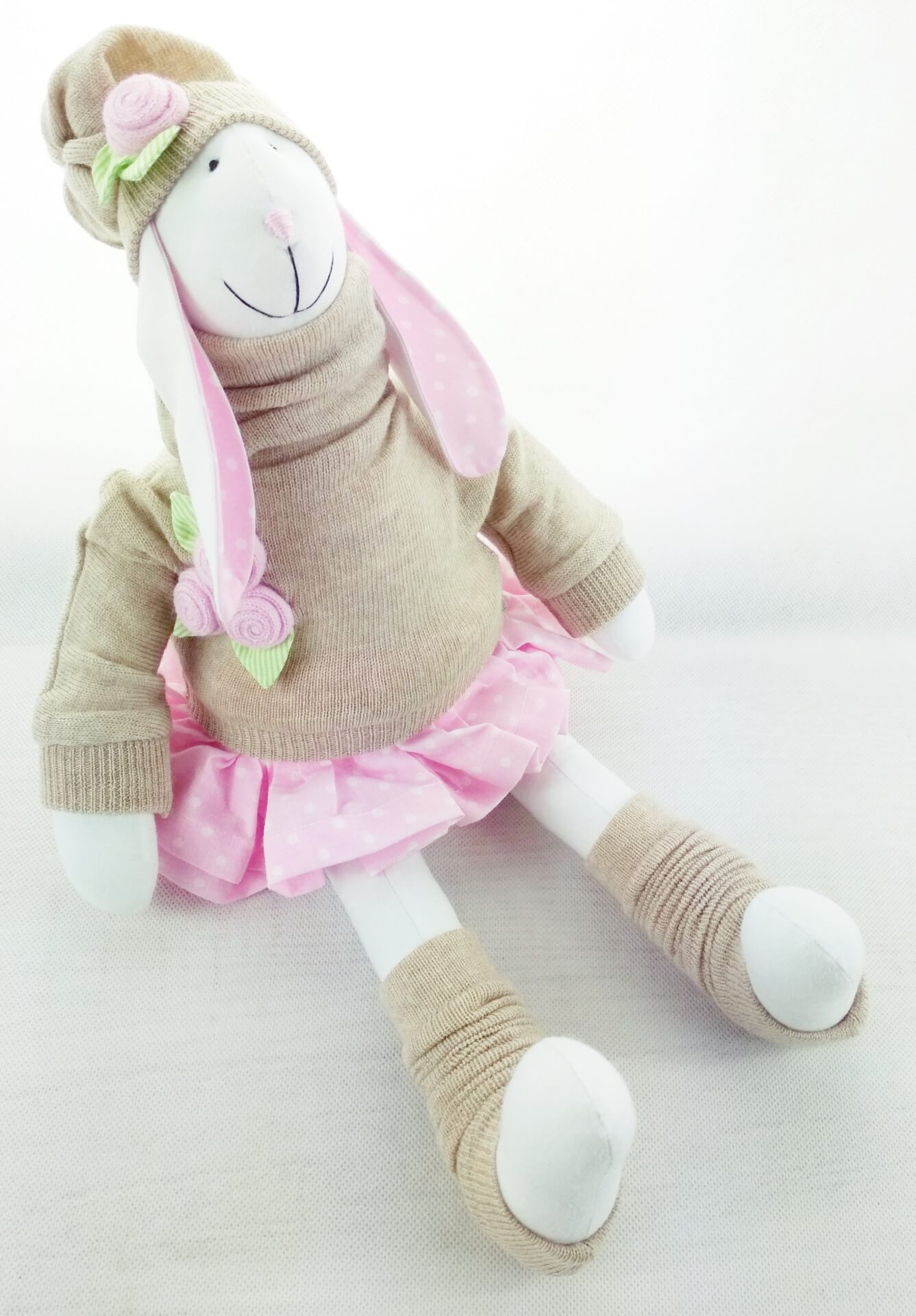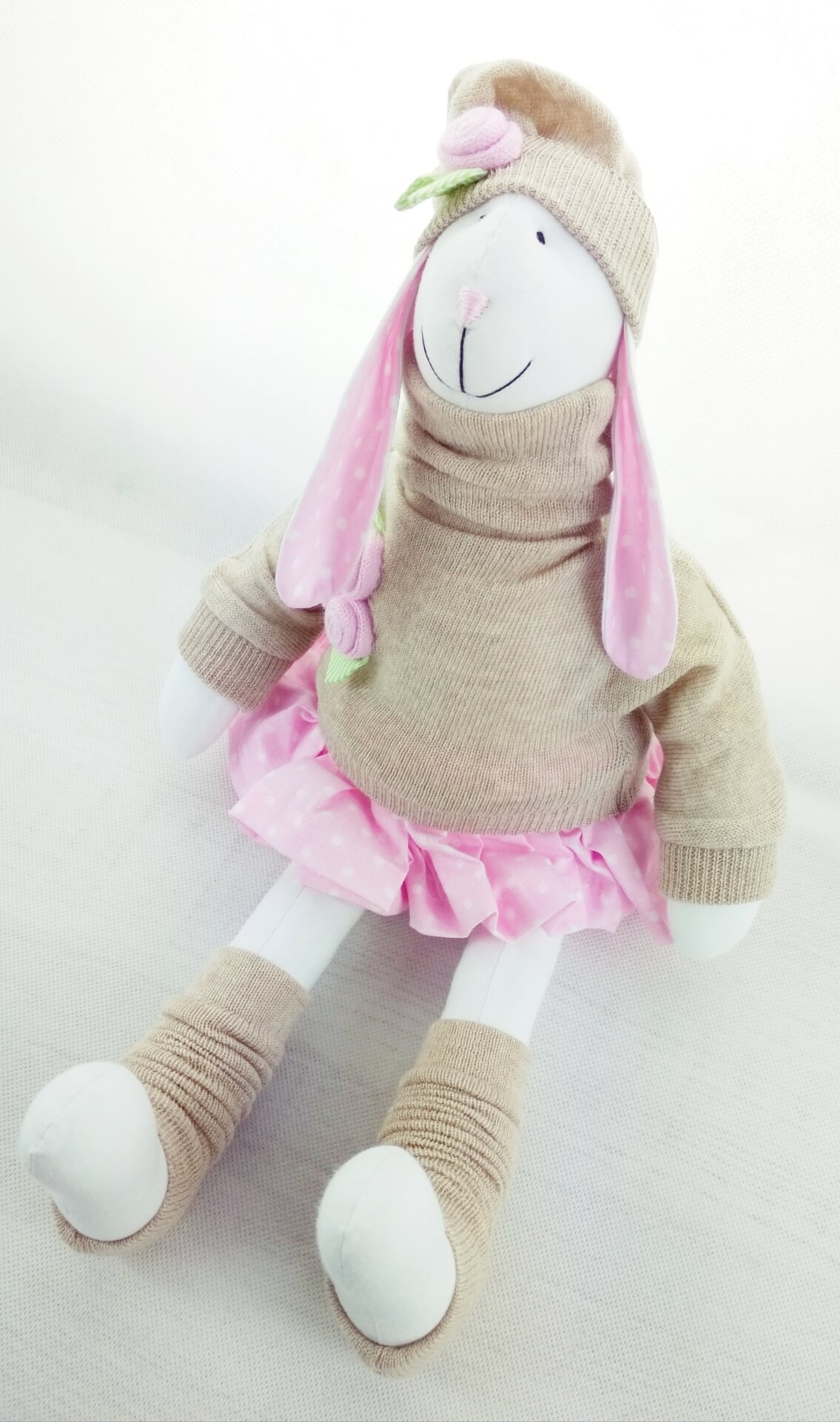 Królik uszyty z milutkiej tkaniny bawełnianej. Ruchome kończyny. Oczka i uśmiech haftowany. Włosy z włóczki akrylowej, Ubranko nie zostało przyszyte na stałe do zabawki i jest starannie wykończone również od spodu.