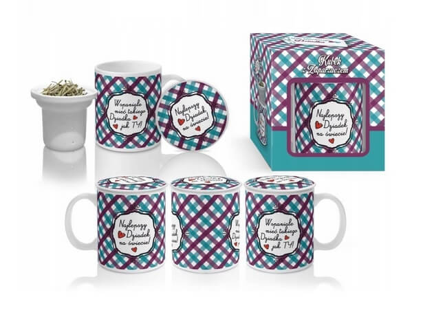 Zestaw składa się z kolorowego kubka, zaparzacza oraz pokrywki. Kubek spakowany jest w kolorowe opakowanie prezentowe.