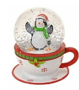 Świąteczna kula wodna z białymi drobinkami imitującymi śnieg. W środku figurka uroczego pingwinka w mikołajowej czapce i zielonym szaliczku.