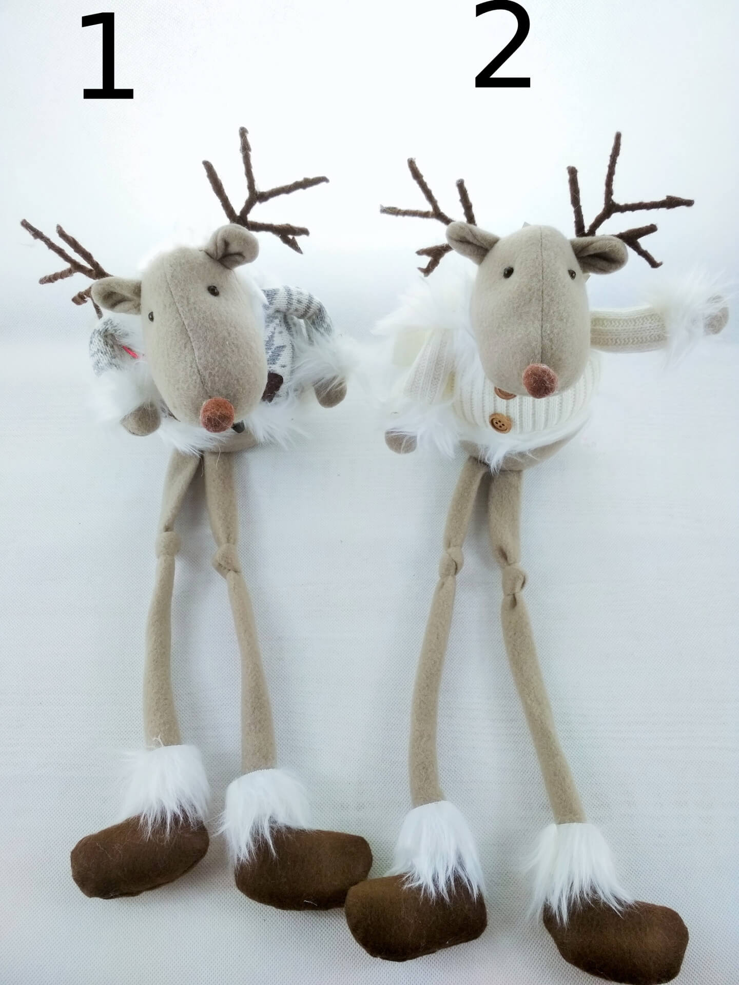 Leon to wesoły renifer wykonany z materiału. Leon ubrany jest szaro-biały sweterek. Poroże Leona jest z drutu i pokryte materiałem(nie wygina się ). Renifer ma długie 30cm zwisające nogi. Ładnie będzie sie prezentował na półce lub parapecie tak aby nóżki mu swobodnie zwisały.