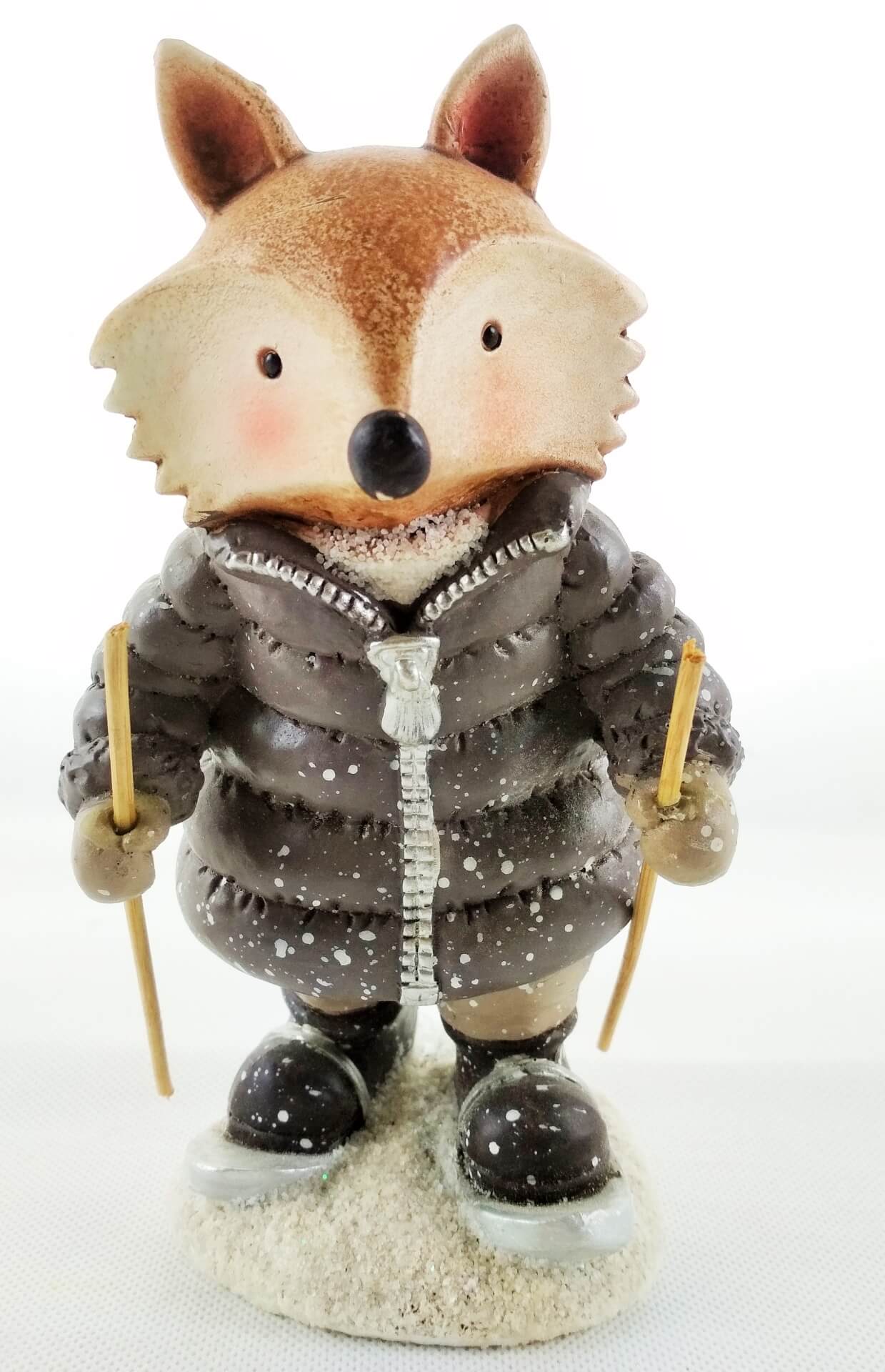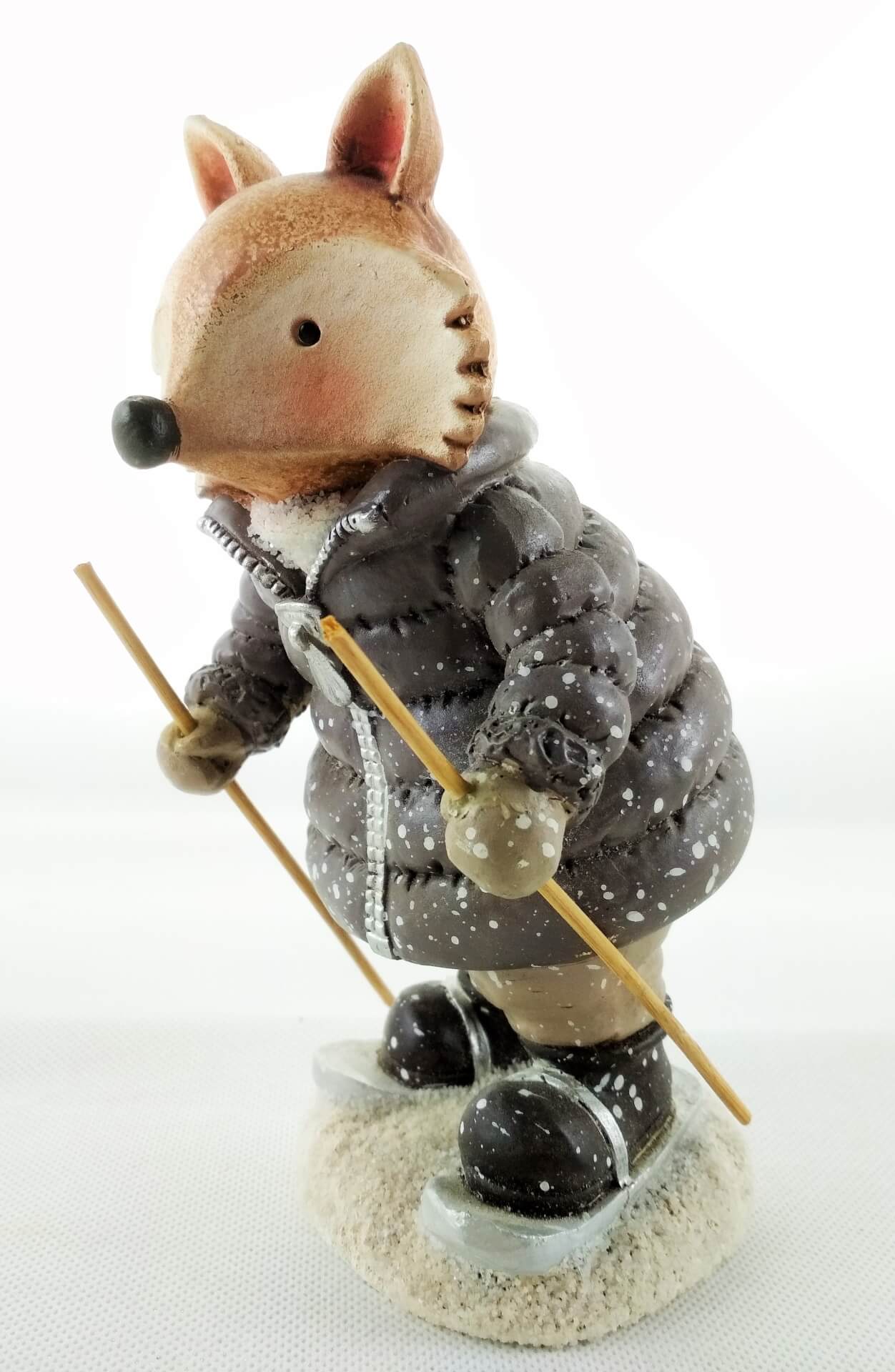 Figurka ceramiczna zimowego lisa wędrującego na śnieżnych rakietach. Kijki drewniane.