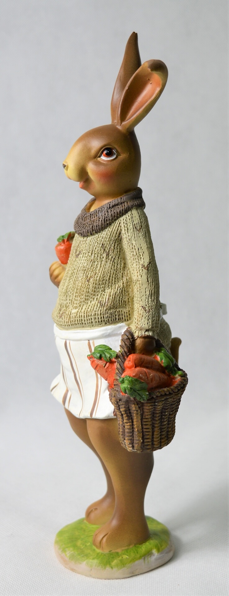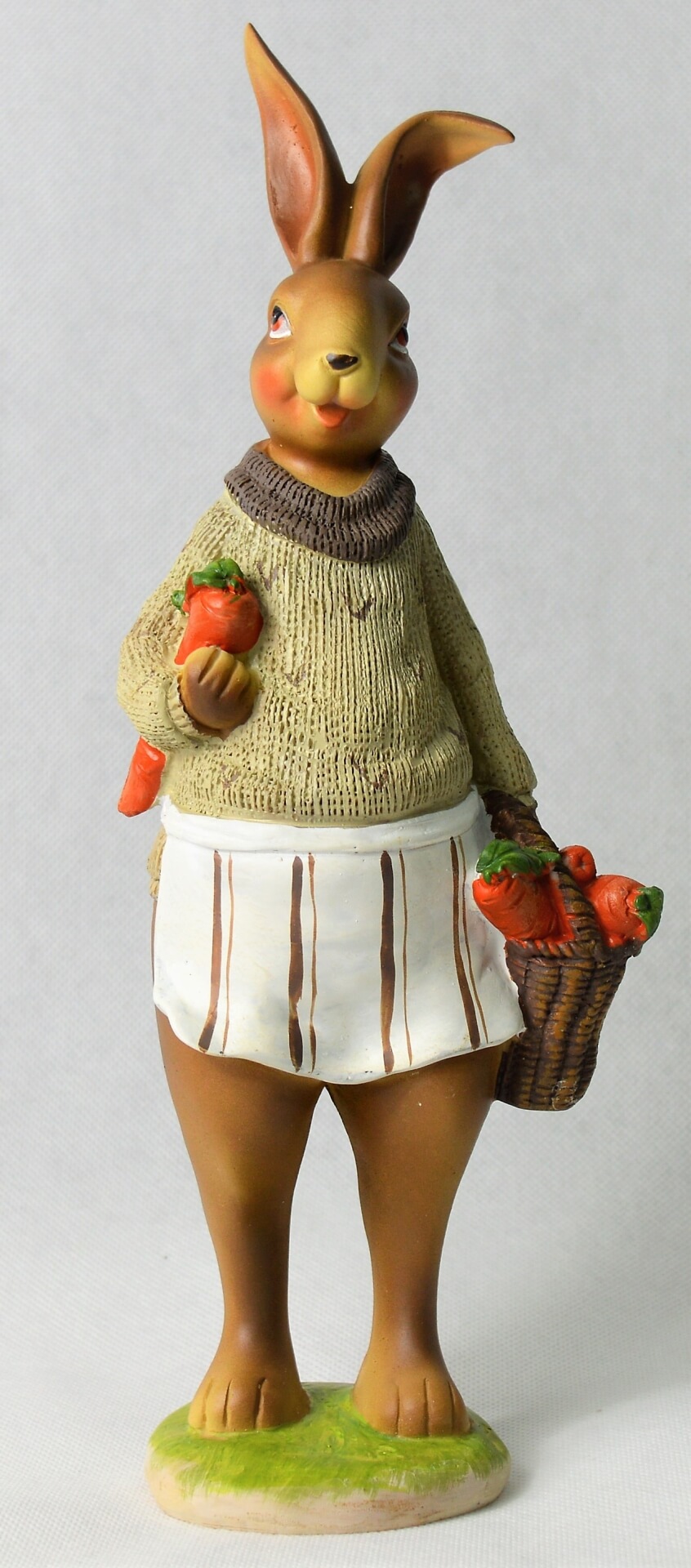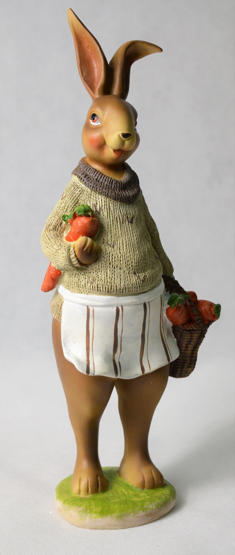 Figurka Pani Zając z koszyczkiem wypełnionym marchewkami. Koszyczek trzymany w dłoni. Całość utrzymana w ciepłych, żywych barwach. Będzie idealna ozdobą pomieszczenia, tarasu czy ogrodu.