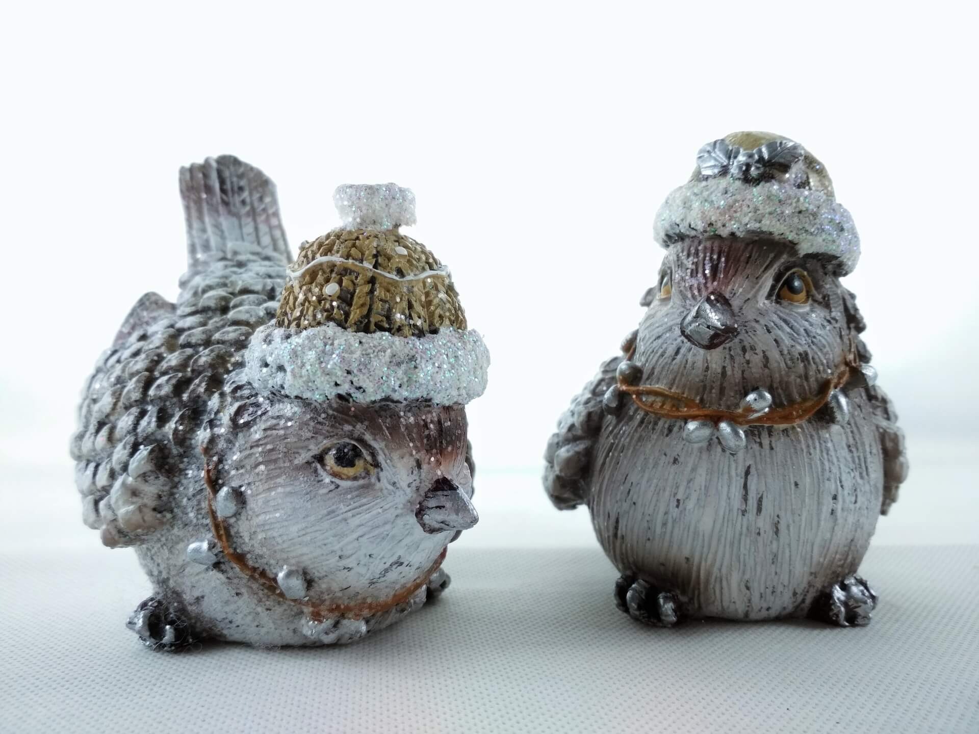 Komplet 2 figurek zimowych ptaszków. Ubrane w ciepłe czapki, na szyi mają naszyjnik świąteczny. Całość wykonana z tworzywa.