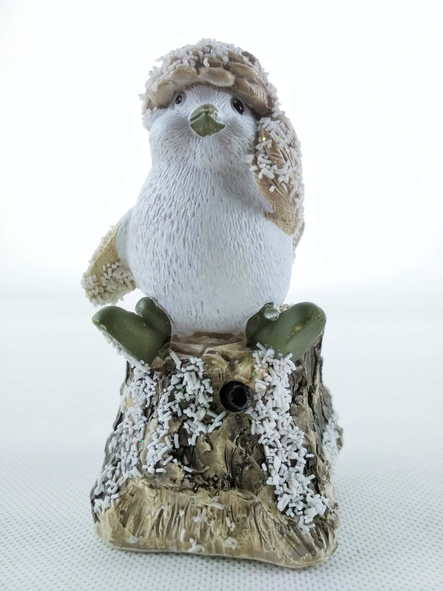 Mała, ceramiczna figurka zimowego ptaszka siedzącego na pniu. Posiada wbudowany czujnik ruchu. Na ruch reaguje ćwierkaniem.