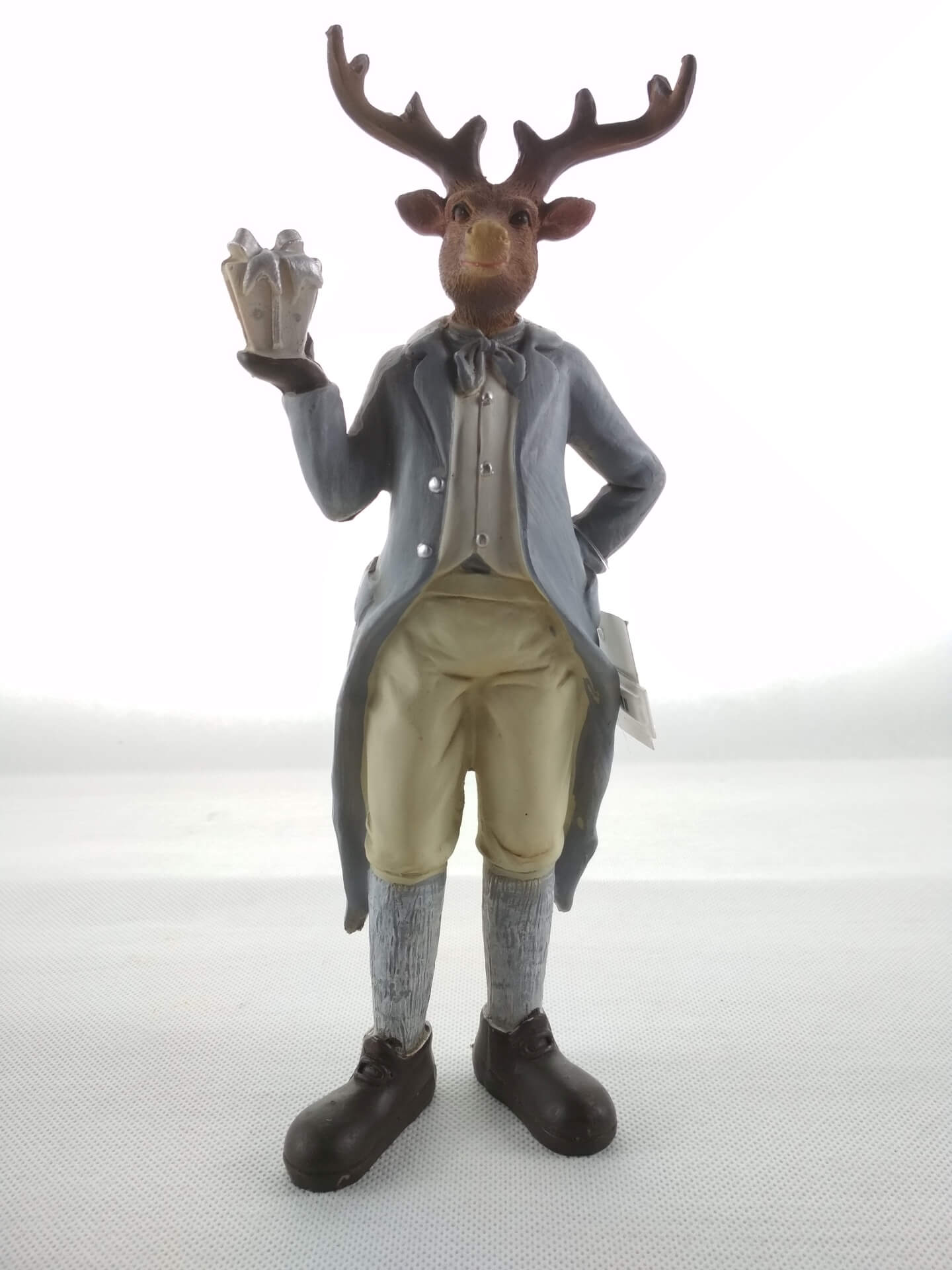 Figurka dostojnego renifera - Lorda ubranego w najbardziej elegancki strój męski - frak. Szaro-kremowa kolorystyka ubrania oraz odcienie brązu renifera idealnie ze sobą współgrają tworząc ponadczasową dekorację nie tylko na święta.