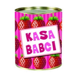 Metalowa skarbonka- puszka "KASA BABCI", grafika w truskawki