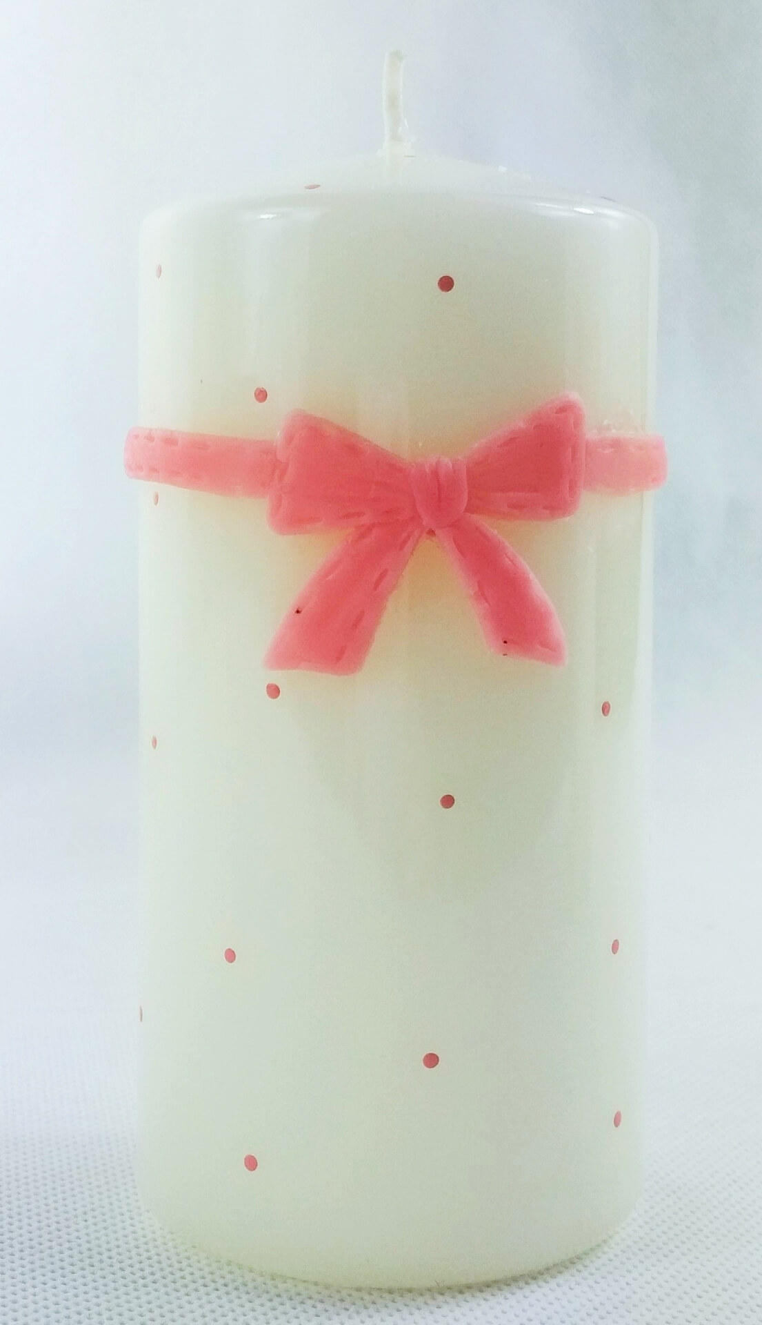 Świeca walec biała z ozdobną różową kokardką (również z wosku) oraz delikatnymi kropeczkami.