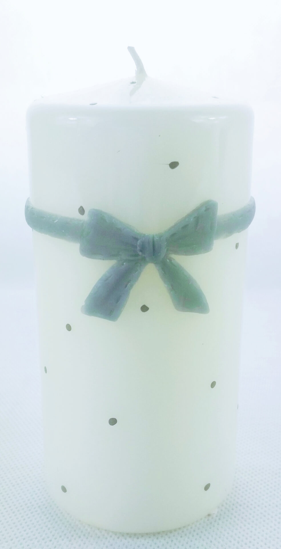 Świeca walec biała z ozdobną szarą kokardką (również z wosku) oraz delikatnymi kropeczkami.