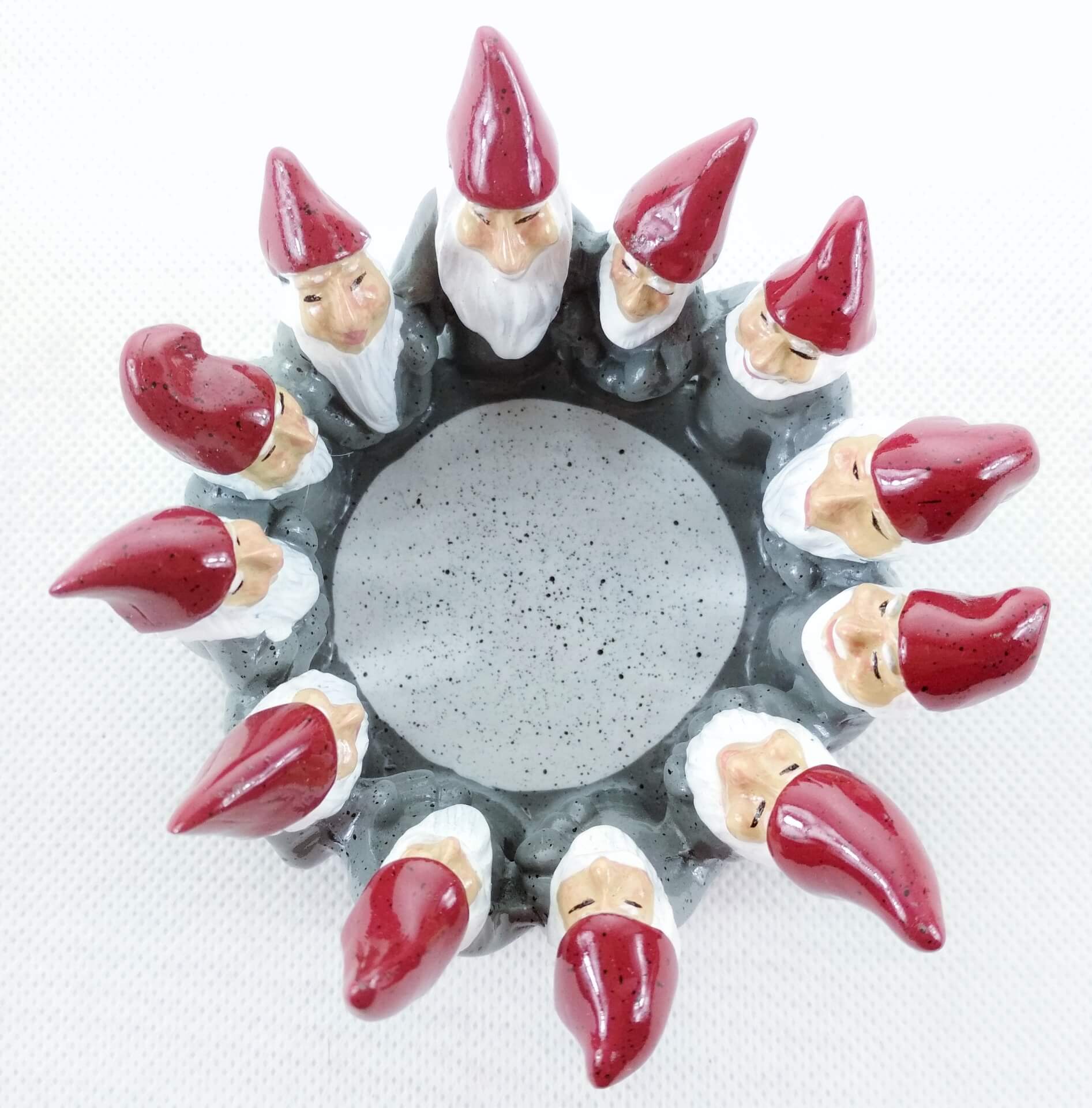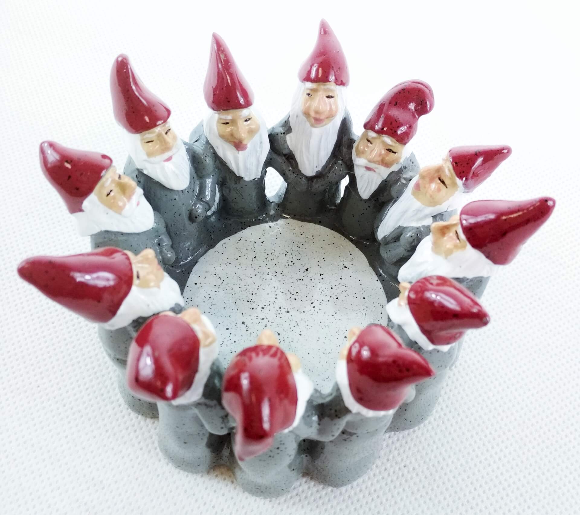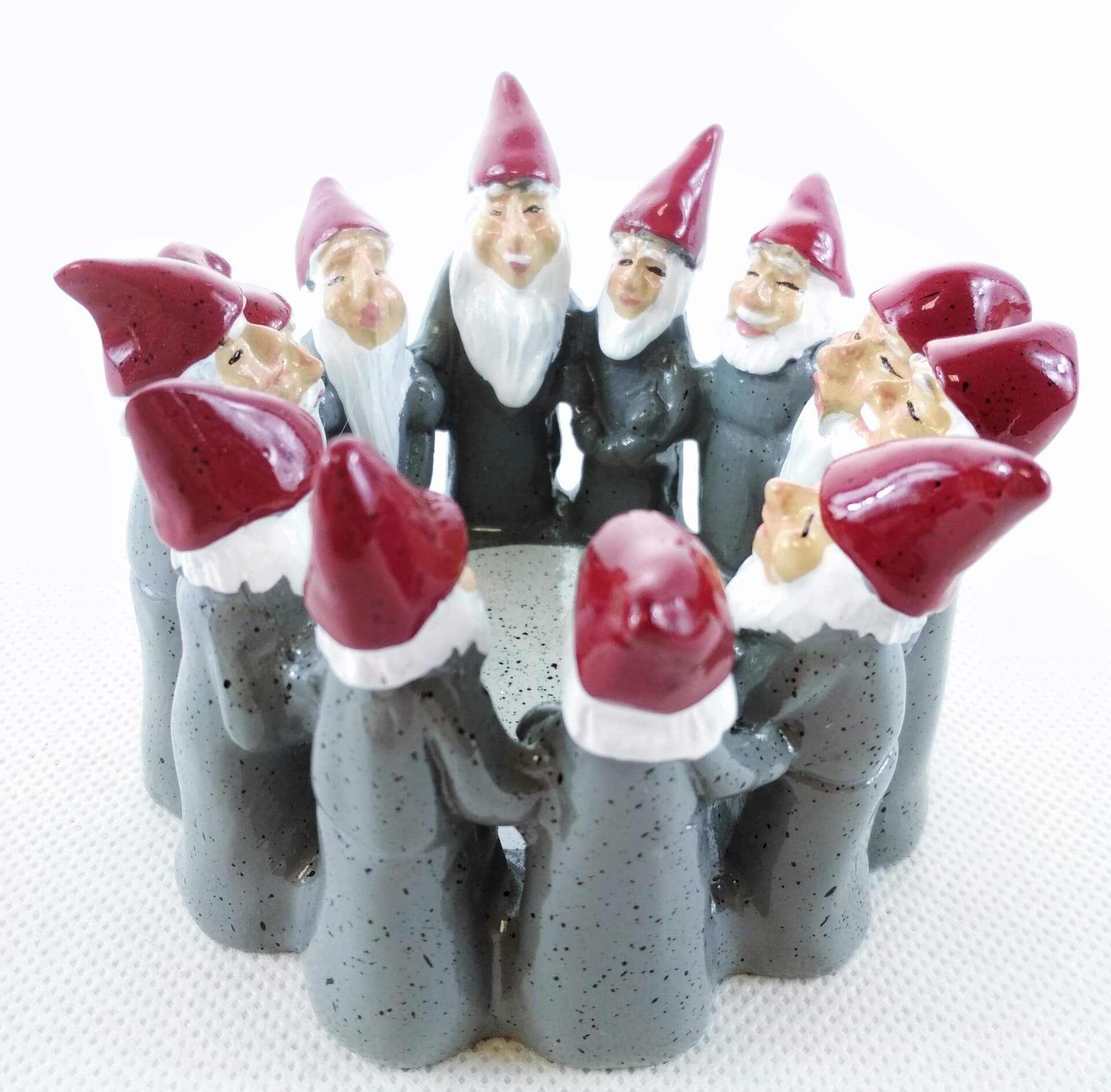 Unikatowy świecznik na tealight lub małą świeczkę w kształcie okręgu składającego się z 12 tańczących Skrzatów/Mikołajów/Krasnali. Skrzaty mają ubranie w kolorze czerwonym.