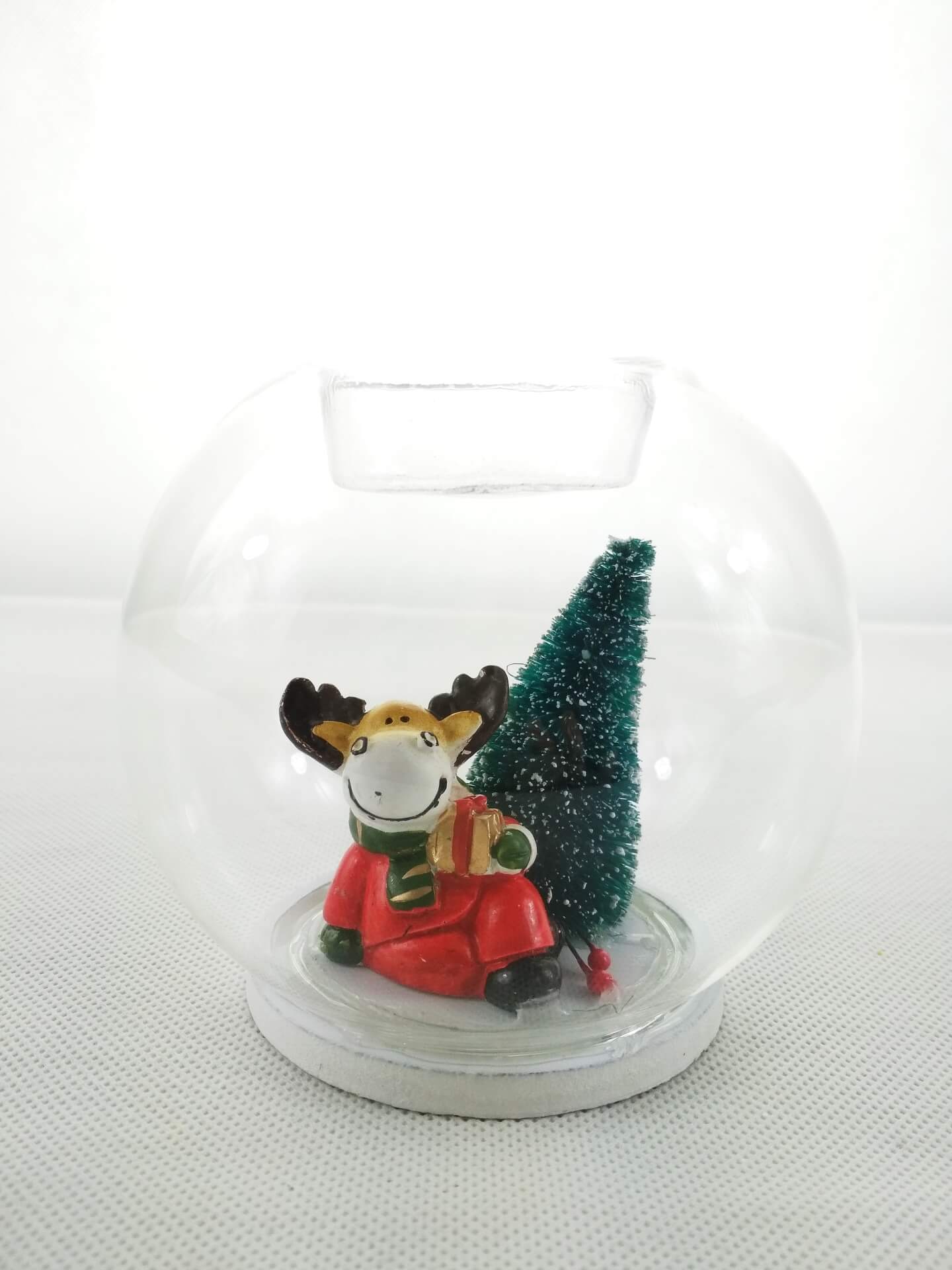 Świecznik na tealight - szklana kula z reniferem i choinką wewnątrz. Na górze miejsce na tealight.