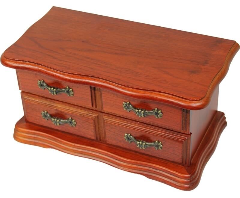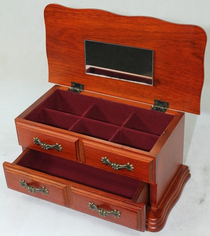 Drewniana szkatułka na biżuterię. Ozdobne detale. Wewnętrzne przegródki wyłożone zamszowym materiałem.