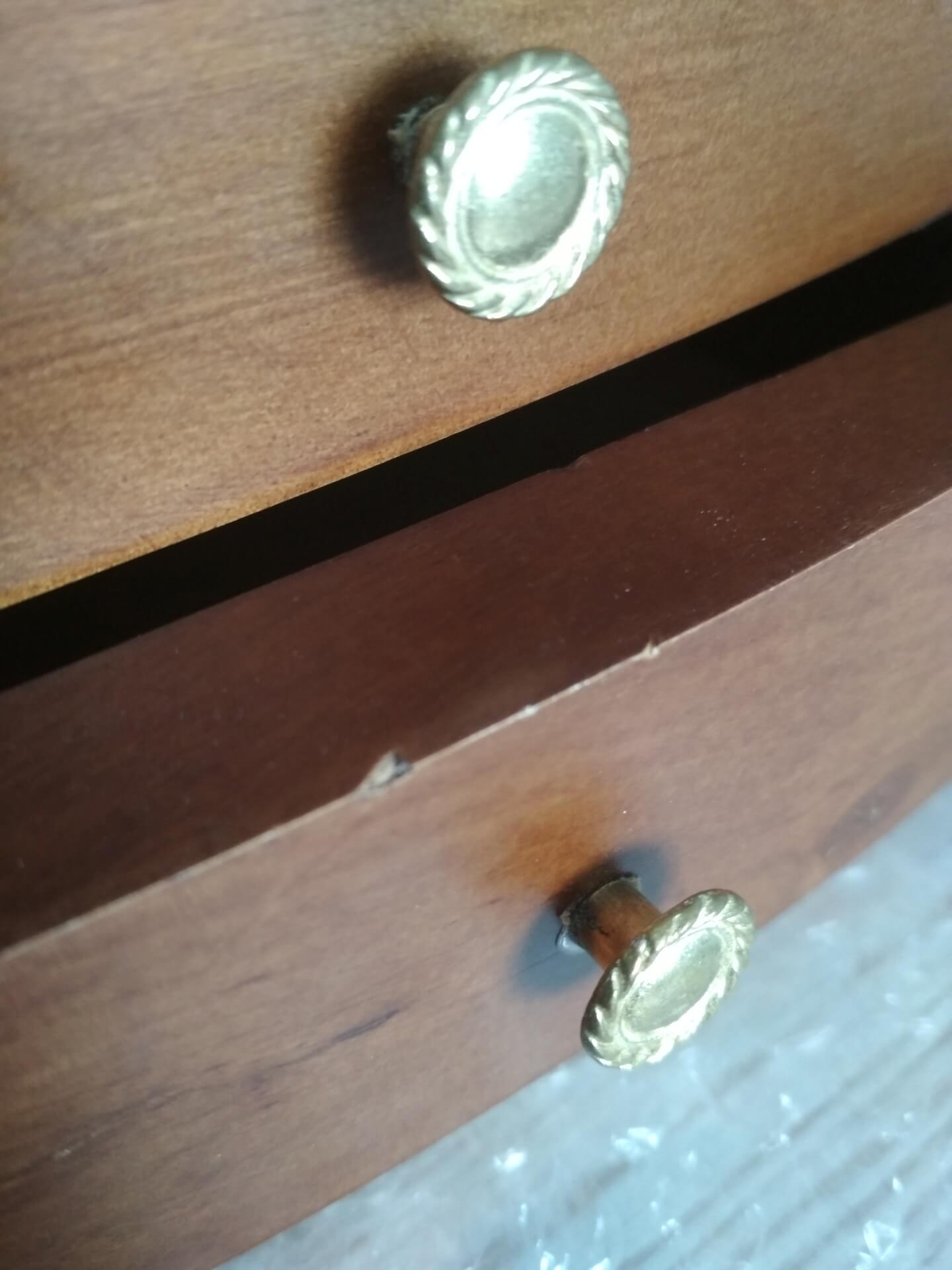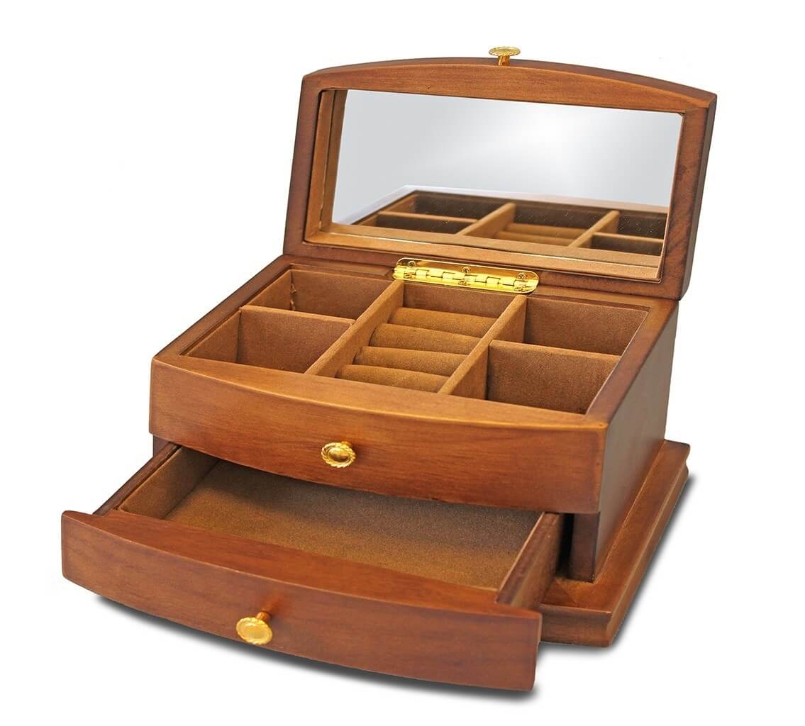 Drewniana. Wewnętrzną stronę klapki stanowi lusterko. Jedna szufladka wyjmowana w całości.