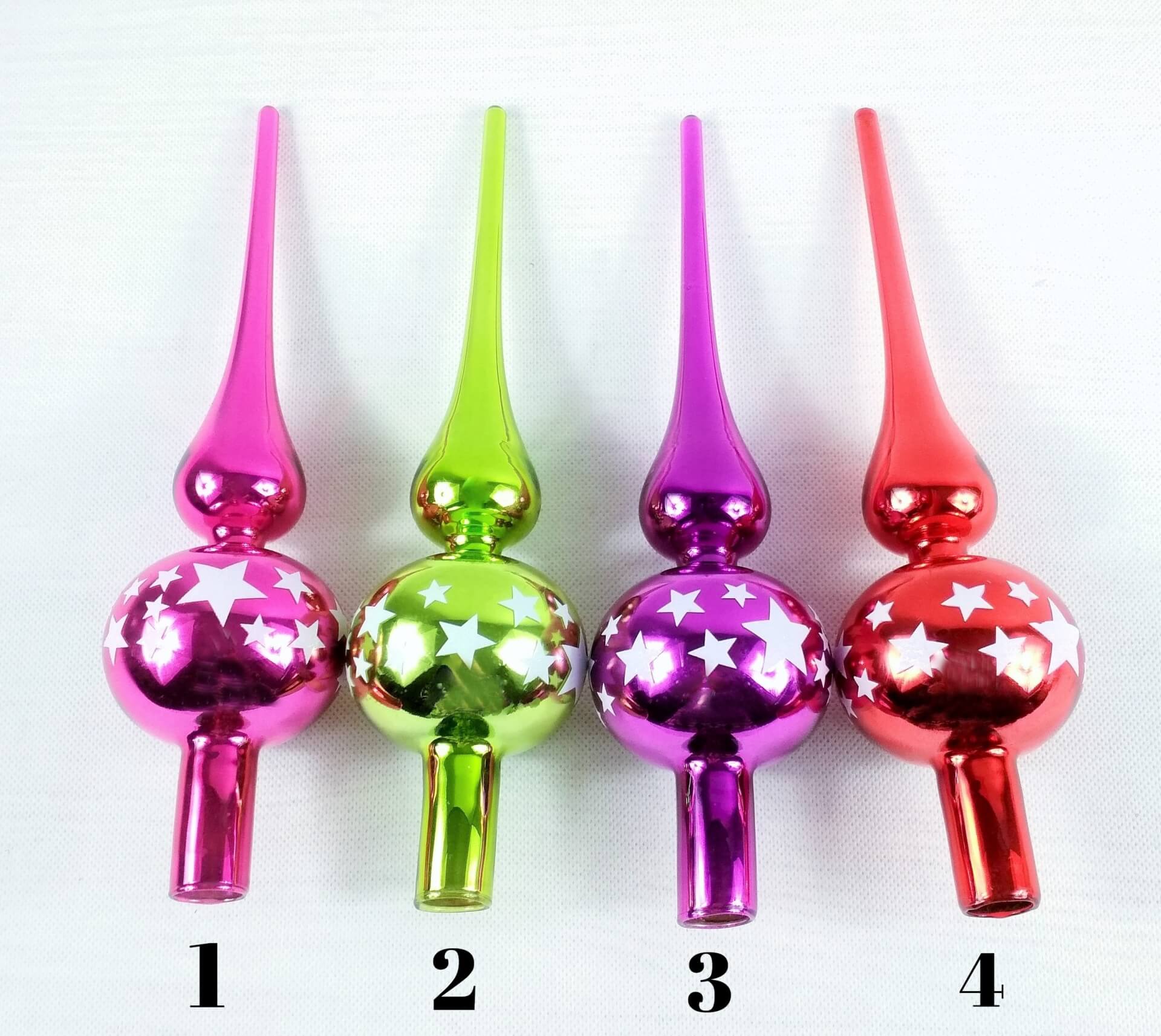 Szklany szpic / czubek na choinkę.Błyszczący z nadrukiem białych gwiazdek.
