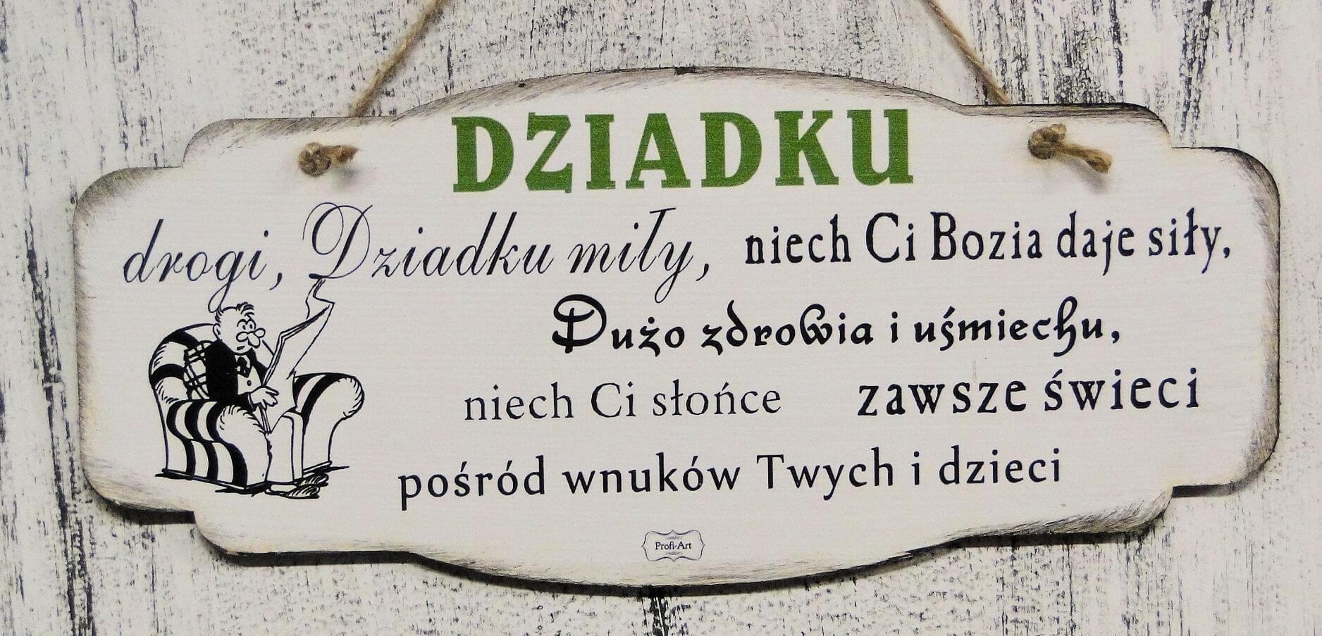 Drewniana tabliczka o ciekawym kształcie. Życzenia dla Dziadka.