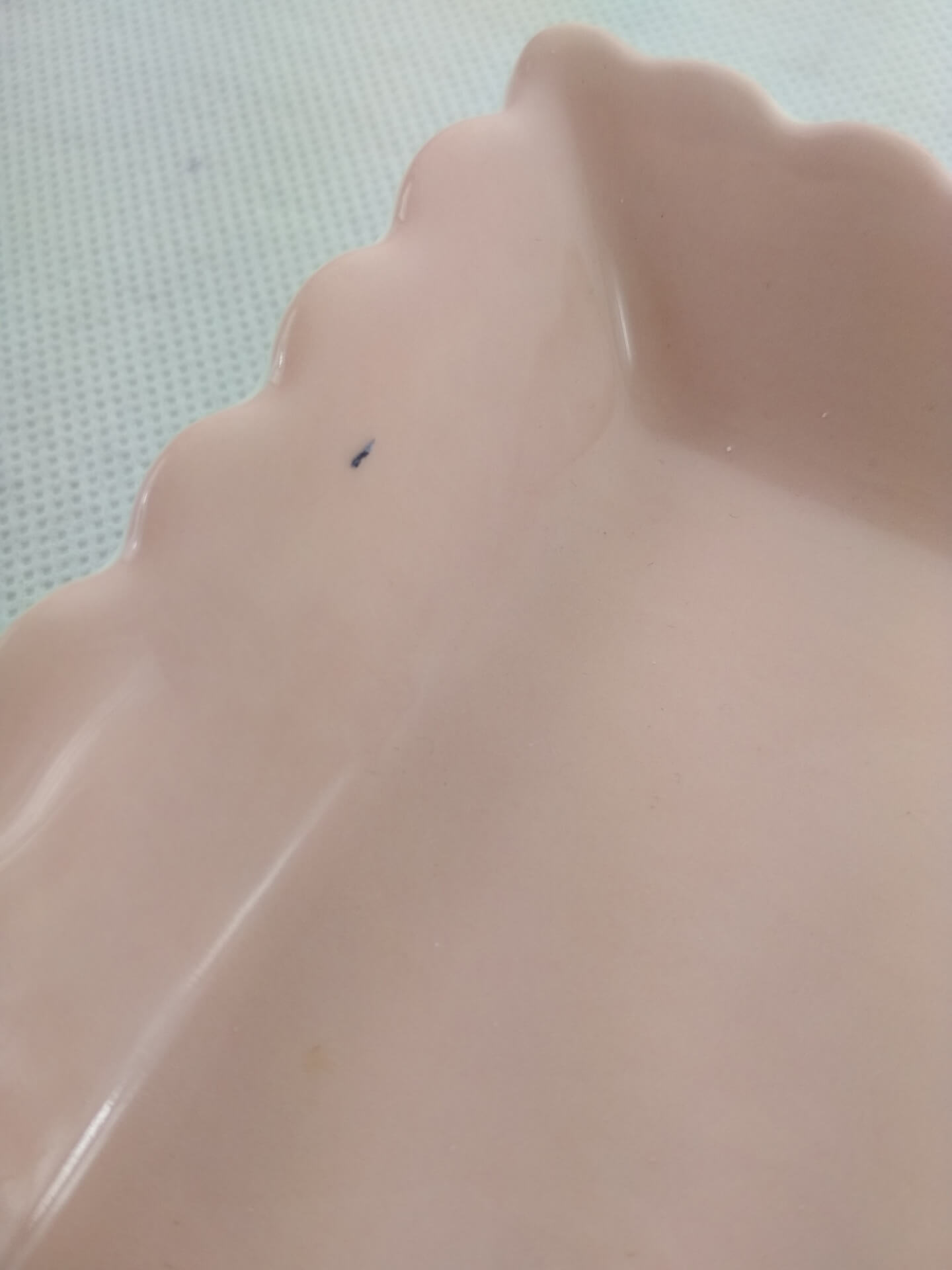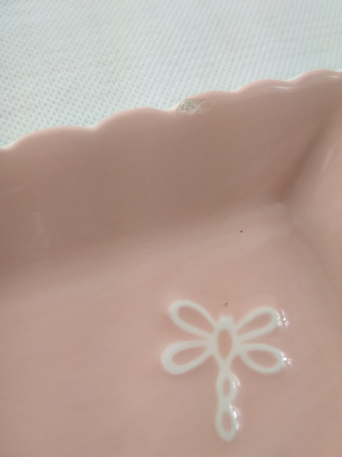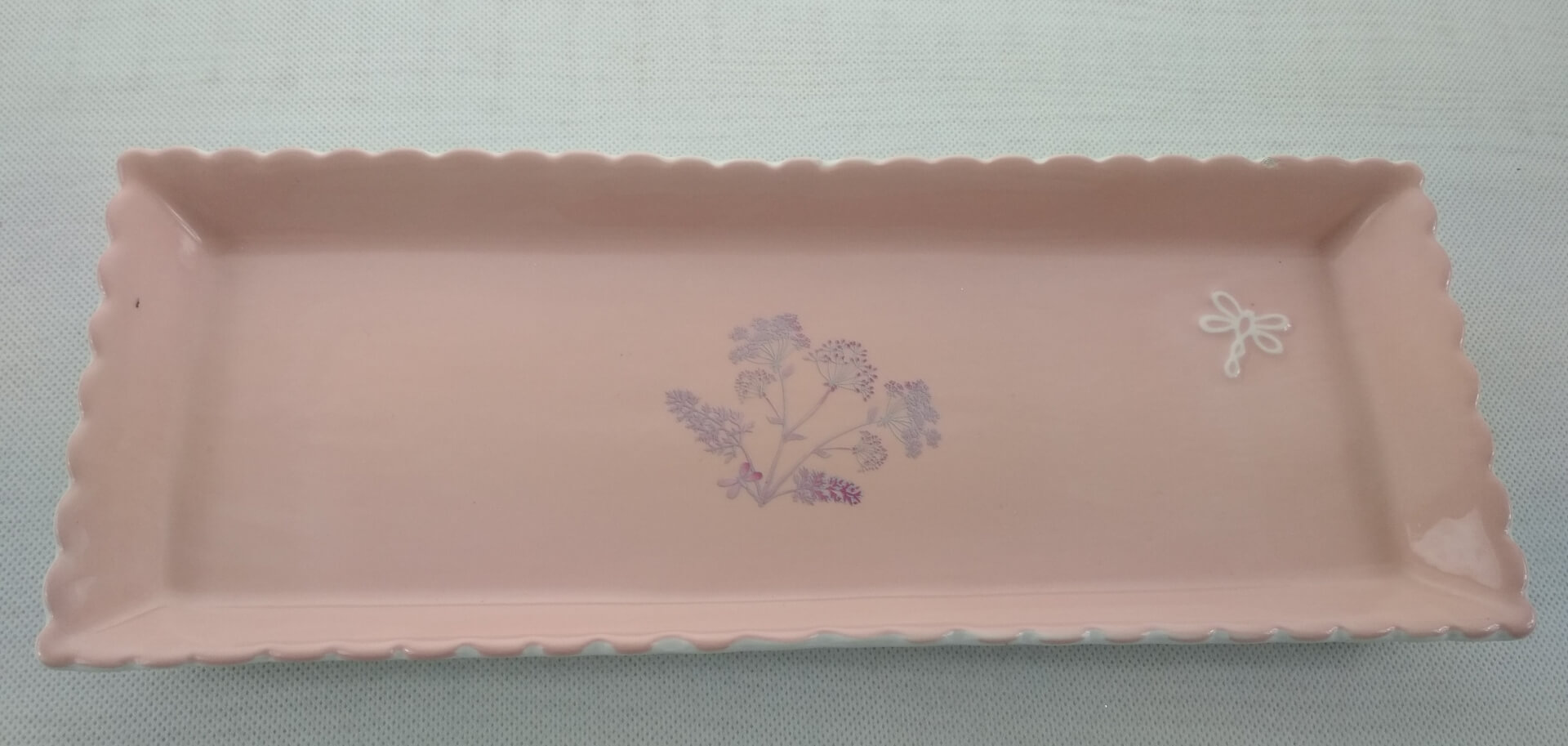 Prostokątny talerz z motywem polnych kwiatów i małej ważki. Koloer jasno różowy.