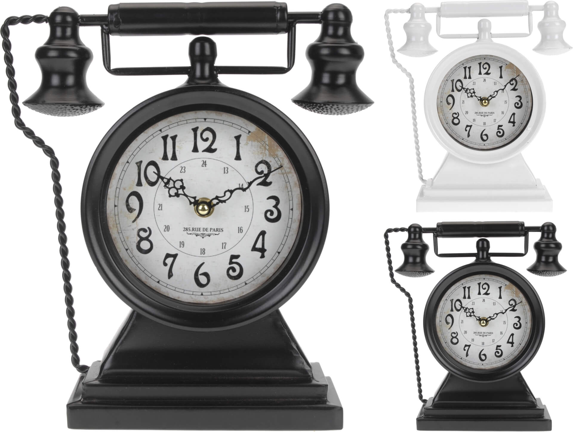 Zegar jest wykonany z metalu i pomalowany farbą. Zegar ma na górze ozdobną słuchawkę w stylu retro, jak w dawnych telefonach stacjonarnych.
