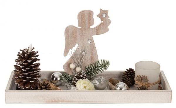 Bożonarodzeniowa dekoracja z drewna. Na tacy aniołek, szyszka, mały lampion oraz kilka drobnych elementów.
