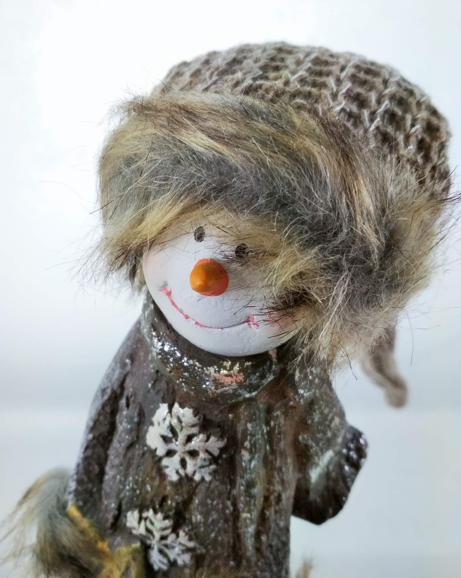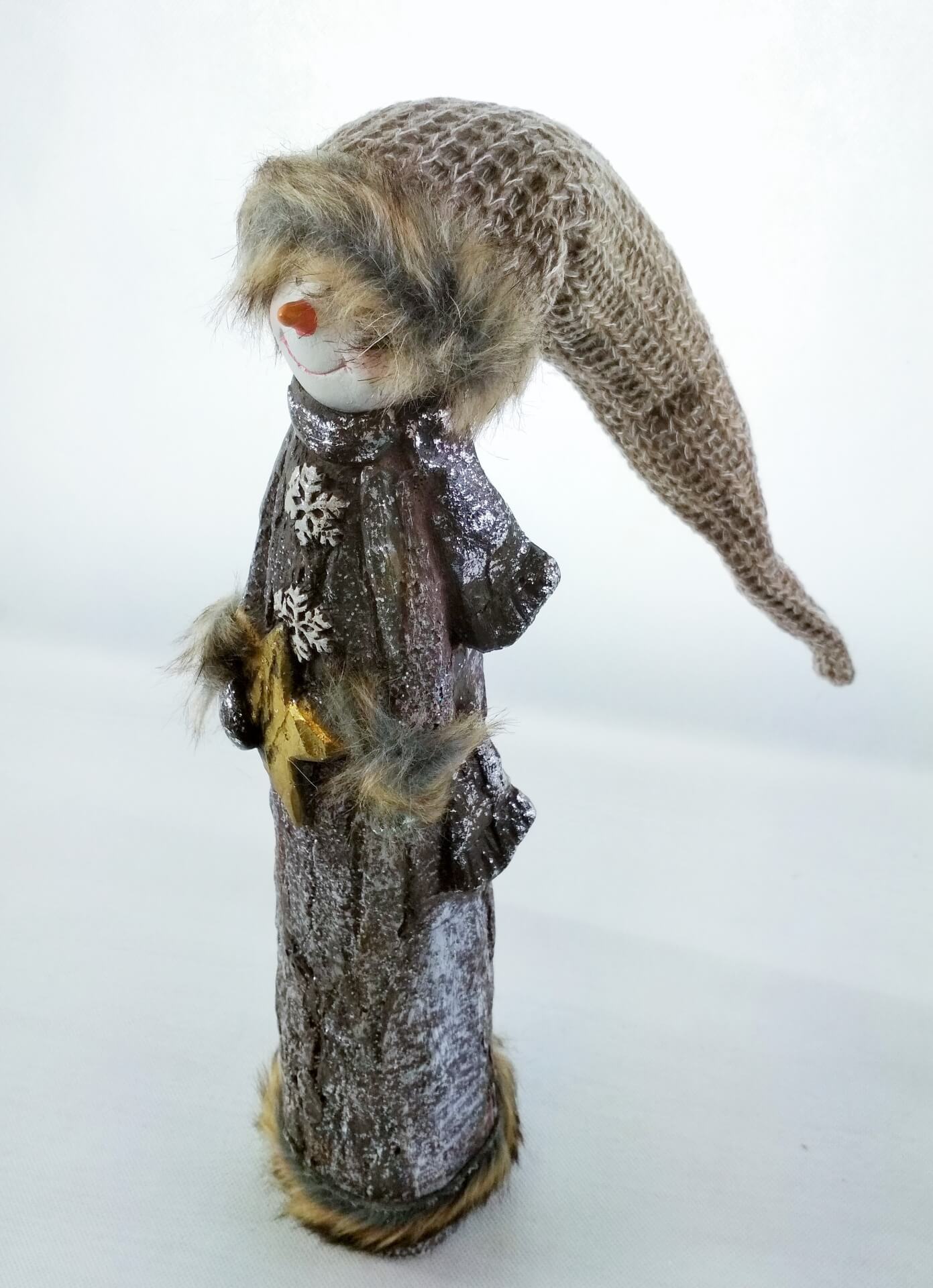 Bałwan ceramiczny, czapka wełniana z otokiem ze sztucznego futerka. Mankiety i dół płaszcza również ozdobione sztucznym futerkiem.