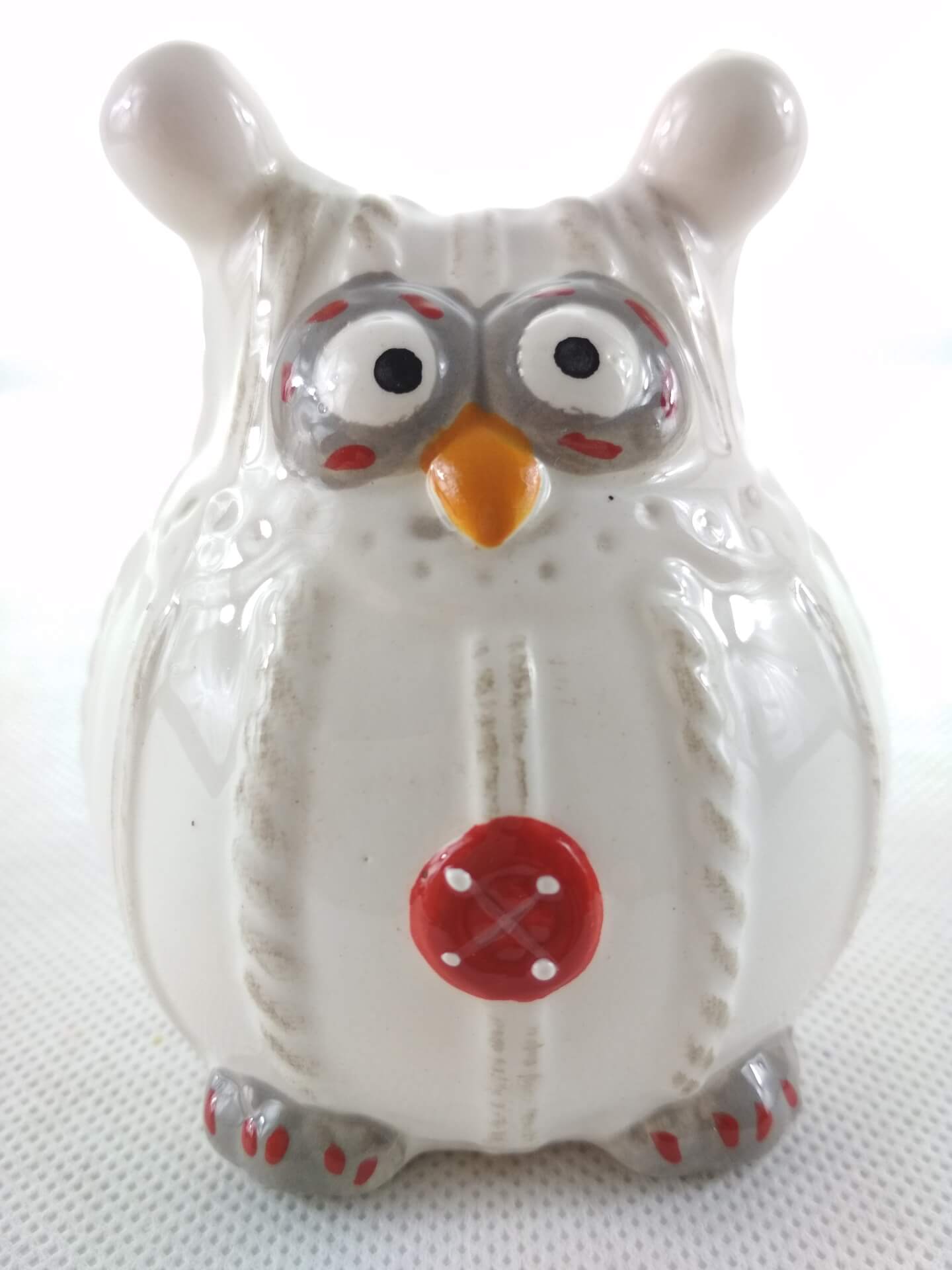 Ceramiczna figurka sowy. Kolor - przybrudzona biel. Zdobienia szare i czerwone.